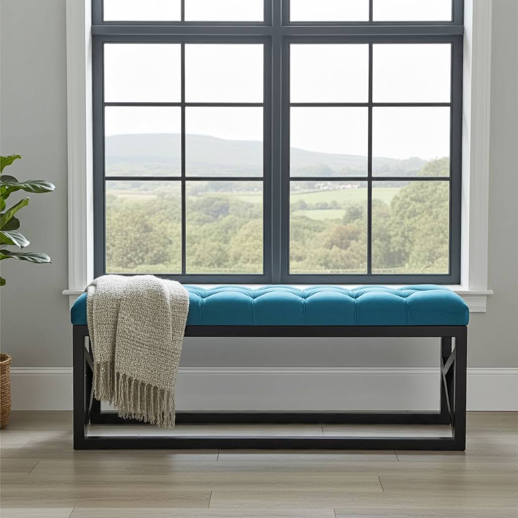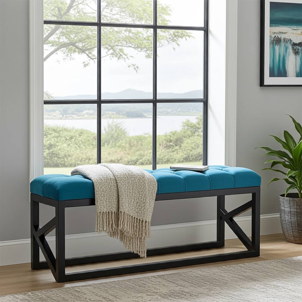 This stunning turquoise velvet bench combines bold color statement with sophisticated craftsmanship through its luxurious diamond-tufted upholstery and modern frame design1. Moreover, it features premium turquoise velvet with intricate diamond-pattern button tufting paired with a sleek black powder-coated steel frame construction. Additionally, the compact 100x30cm dimensions provide stylish seating while maintaining a streamlined profile perfect for narrow spaces. Furthermore, the vibrant turquoise color brings energetic sophistication to contemporary Irish living environments.