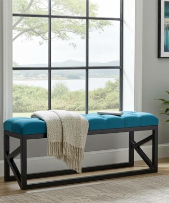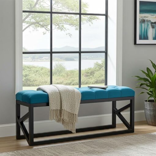 The bench showcases premium turquoise velvet upholstery with meticulous diamond-pattern tufting that creates sophisticated texture and visual depth1. Additionally, the bold turquoise tones provide eye-catching styling options that serve as statement pieces in various interior color schemes. Meanwhile, the black powder-coated steel frame ensures exceptional structural integrity and contemporary appeal. Similarly, the handcrafted construction delivers superior quality suitable for daily residential use and entertaining.
