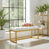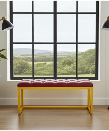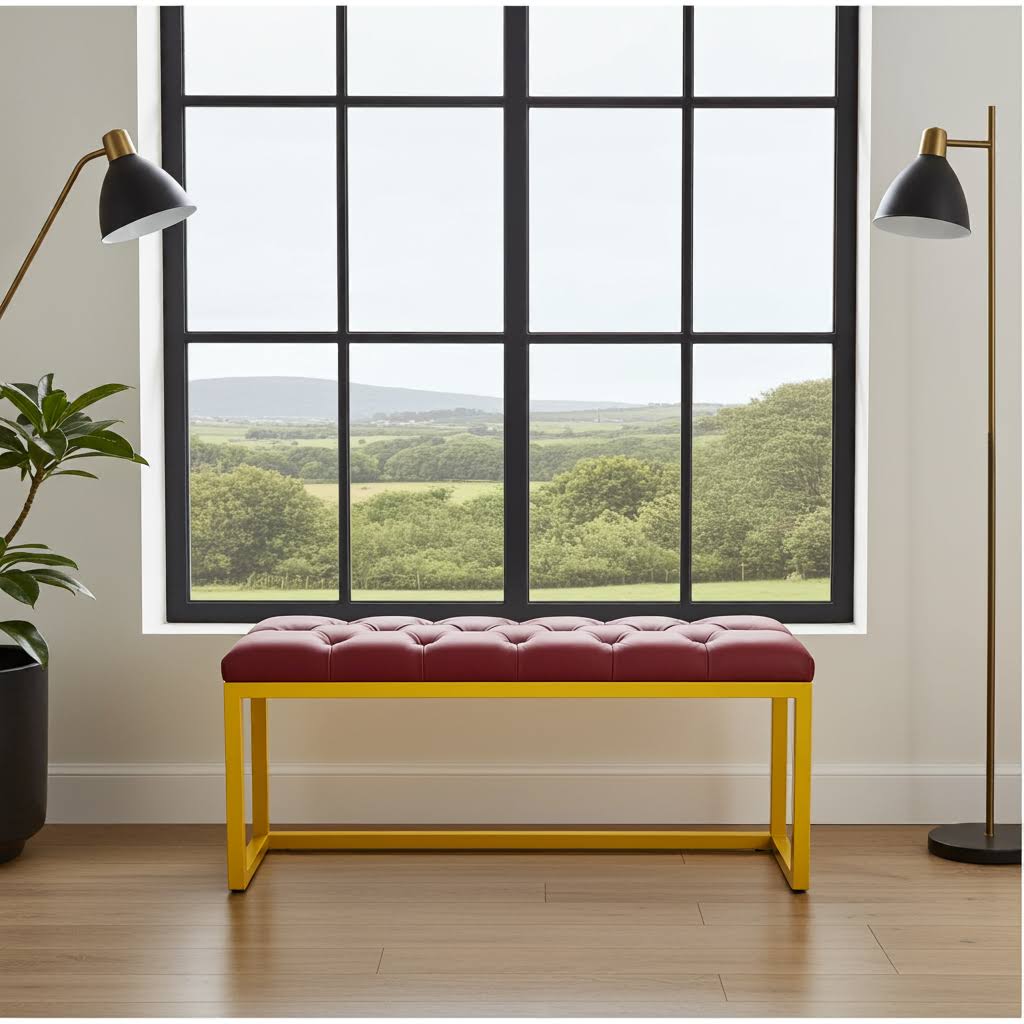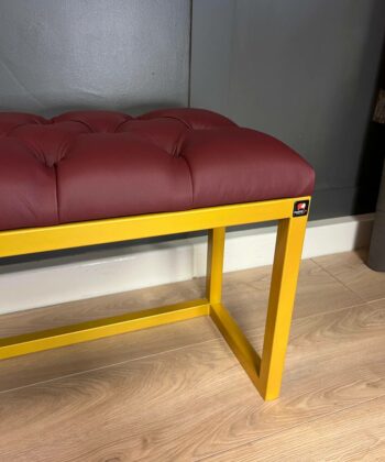 Firstly, the bench features a tufted seat made from high-quality eco leather. This material is not only durable but also easy to maintain. In addition, the yellow powder-coated metal frame ensures stability and long-lasting use. You can place this bench in narrow spaces, as its compact size—100cm long, 30cm wide, and 40/50cm high—fits perfectly in hallways or at the end of a bed. Moreover, the combination of burgundy and yellow adds energy and character to your décor.