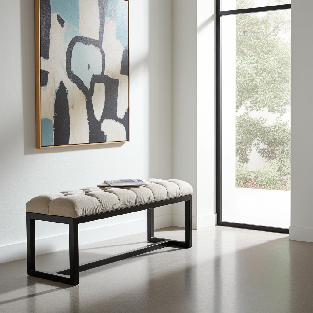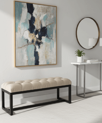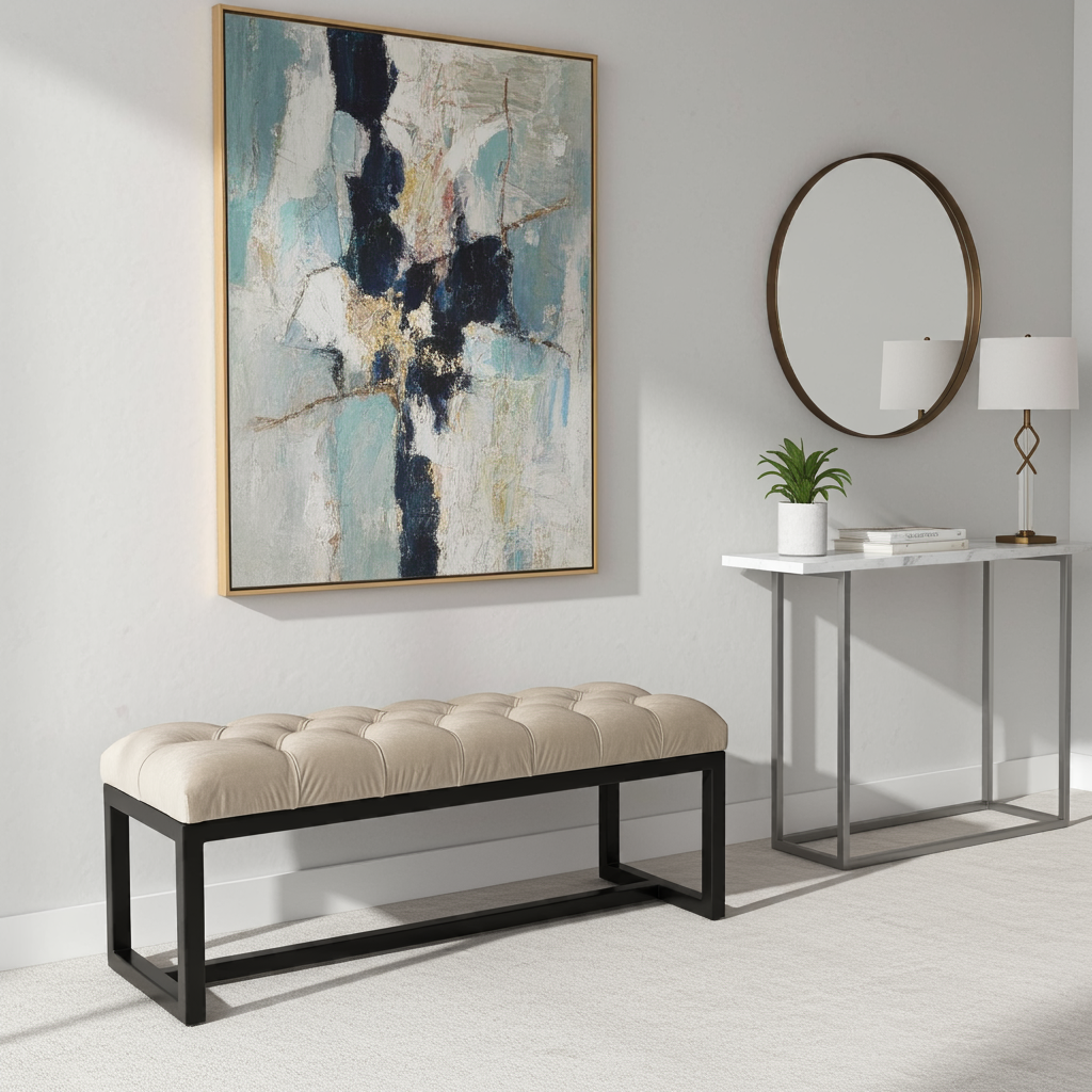 Add a touch of refined elegance to your space with the UrbanChic Metal-Framed Bench 100x30cm. This bench features a plush, tufted champagne velvet seat and a sleek black powder-coated metal frame. The luxurious velvet upholstery not only provides a soft, inviting surface but also elevates the look of any hallway, bedroom, or living room. Because of its neutral champagne tone and bold frame, this bench easily complements both contemporary and classic interiors.