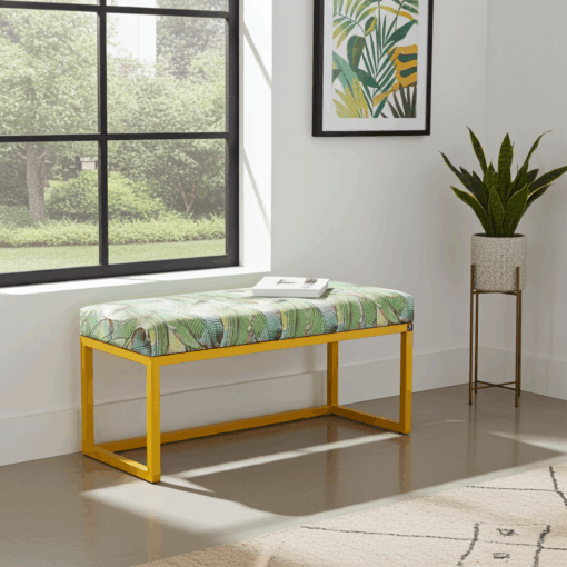Bring a lively, nature-inspired accent to your home with the UrbanChic Metal-Framed Bench 100x30cm. This bench features a vibrant botanical-patterned green velvet seat and a bold yellow powder-coated metal frame, creating a fresh and modern look. The unique combination of colours and textures makes it an ideal choice for hallways, bedrooms, living rooms, or any space that needs a cheerful, contemporary touch.