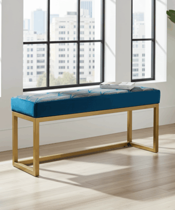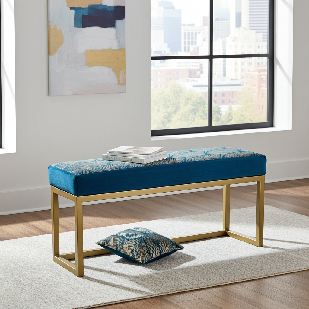 This Art Deco Patterned Velvet Bench from the UrbanChic Collection combines timeless elegance with modern craftsmanship. The bench features a plush, geometric-patterned blue velvet seat, paired with a striking gold powder-coated metal frame. Its unique upholstery and matching cushion add a sophisticated accent to any space, making it a standout piece for hallways, bedrooms, or living rooms.