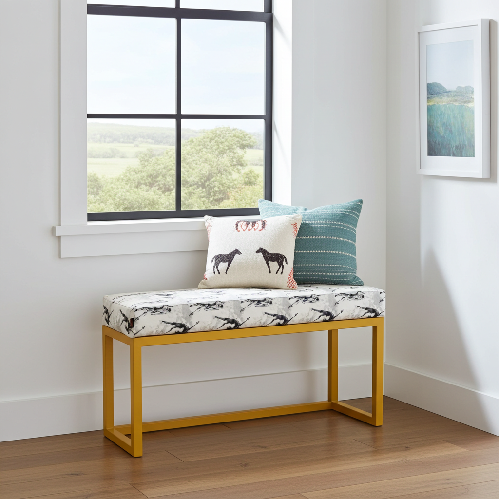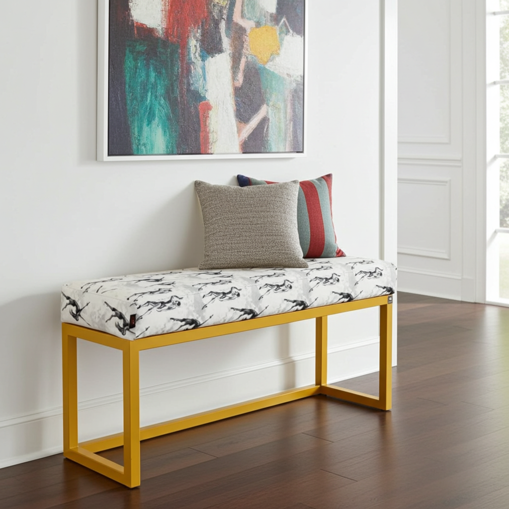 Add a bold accent to your home with the UrbanChic Artistic Figure Print Velvet Bench 100x30cm. This handmade bench features a plush velvet seat with a unique artistic figure pattern in black and white, set against a stylish yellow powder-coated metal frame. The combination of vibrant upholstery and a geometric metal base creates a striking, contemporary look that stands out in any hallway, bedroom, or living room.
