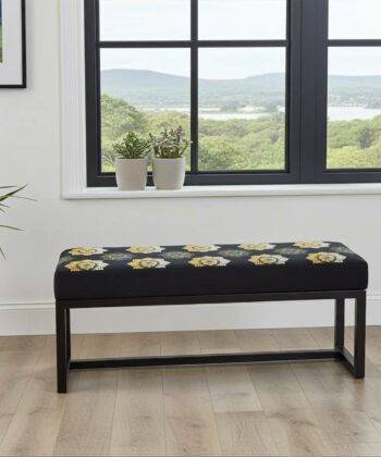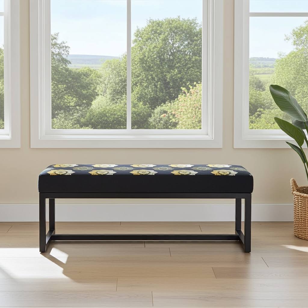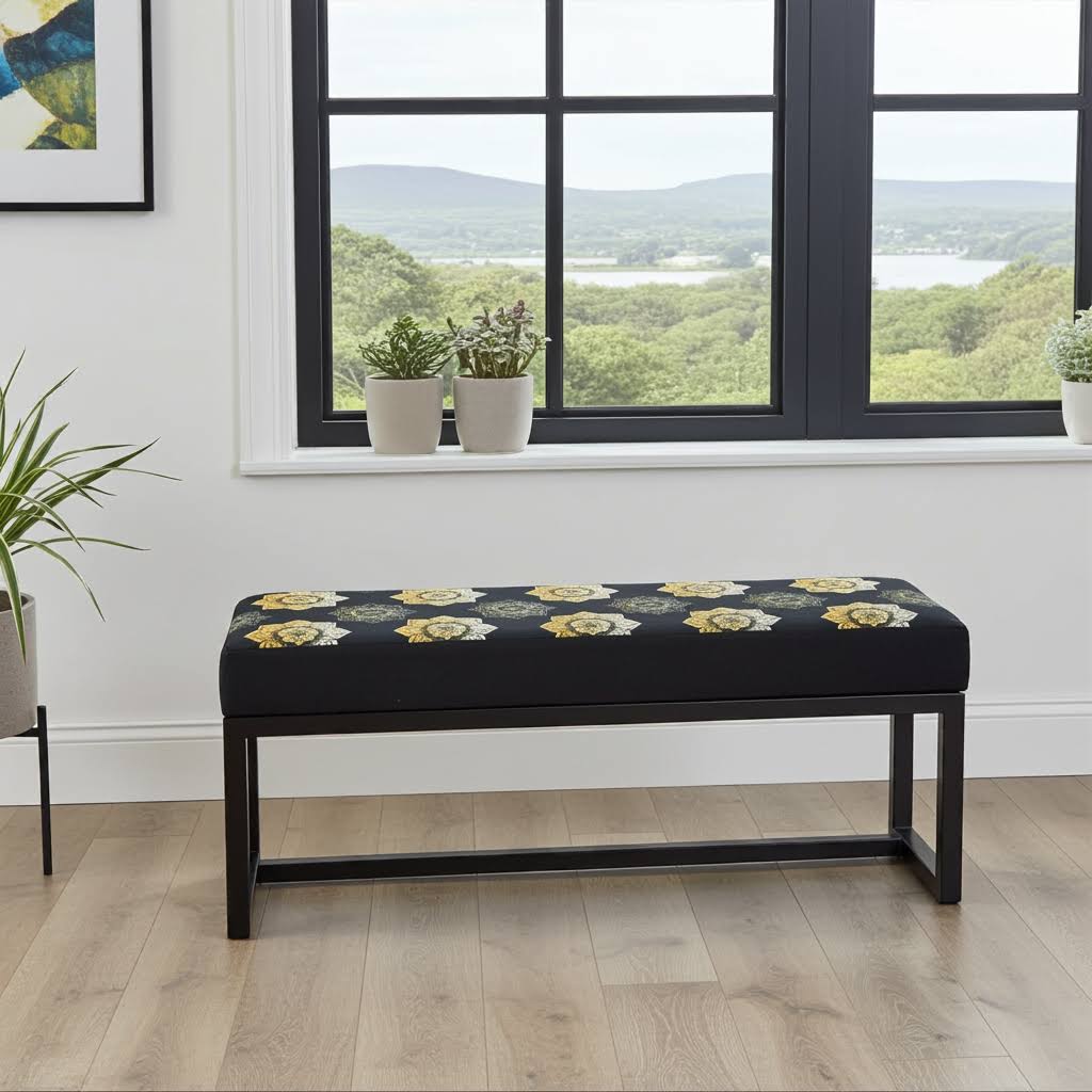 Add a unique touch to your home with the UrbanChic metal-framed bench from PouffeLove. This bench features a striking hand-stitched velvet seat with a bold floral pattern, set on a sleek, powder-coated black metal frame. Measuring 100cm in length, 30cm in width, and 40cm in height, it offers comfortable seating while fitting easily into hallways, bedrooms, living rooms, or entryways.