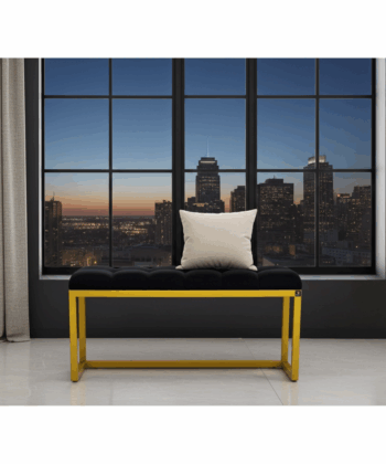 To begin with, the bench offers a plush, tufted black velvet seat that feels soft and inviting. The yellow metal frame, finished with a durable powder coating, not only adds a cheerful touch but also protects against daily wear. Because the bench measures 100cm in length, 30cm in width, and 40/50cm in height, it fits perfectly in smaller spaces or at the end of a bed. Moreover, the sturdy construction guarantees stability and long-lasting quality, so you can enjoy both style and function for years.