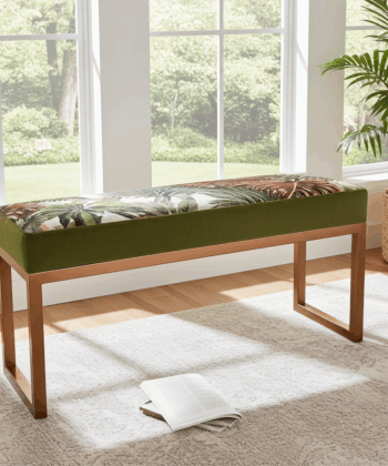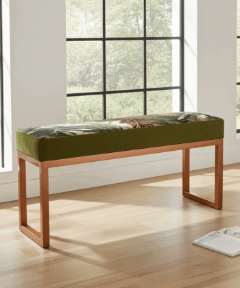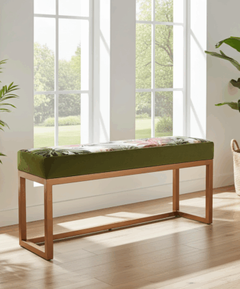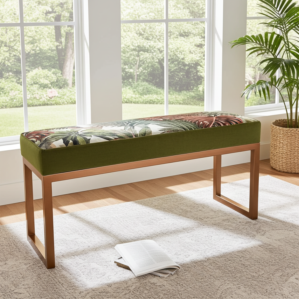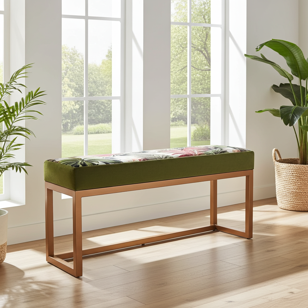 Transform your hallway, bedroom, or living area with the UrbanChic Metal-Framed Bench 100x30cm. This unique bench features a plush botanical-patterned velvet seat with olive green sides, perfectly paired with a powder-coated terracotta metal frame. The combination of vibrant upholstery and warm, earthy frame tones creates a striking focal point, ideal for modern Irish homes seeking both comfort and style.