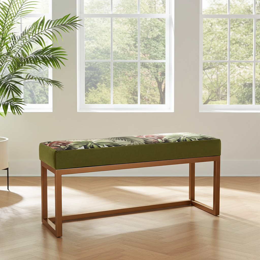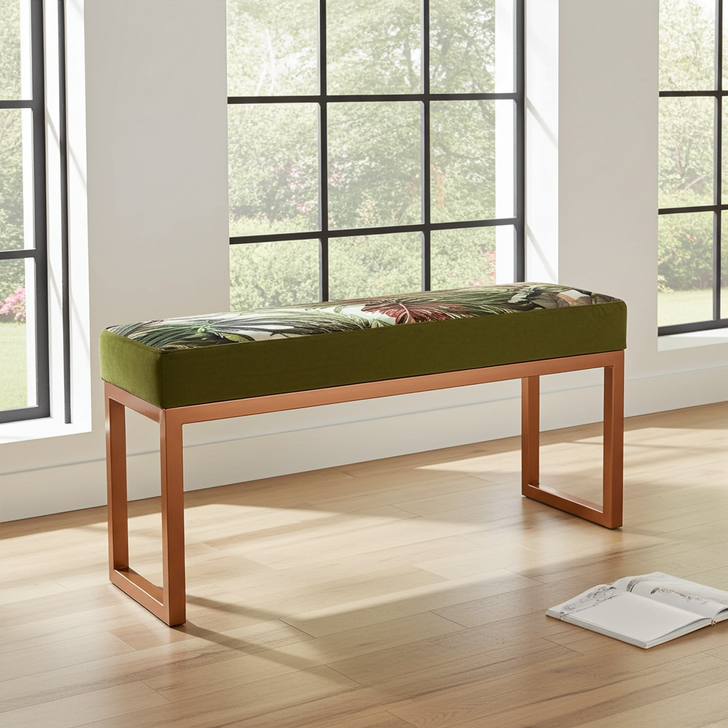 Handcrafted with attention to detail, this bench offers a thick, comfortable velvet seat upholstered in a leafy botanical print, complemented by olive green velvet sides. The terracotta powder-coated metal frame provides excellent stability, durability, and a contemporary look that stands out in any setting. Its compact dimensions—100cm long, 30cm wide, and 50cm high—make it suitable for smaller spaces without sacrificing seating comfort.