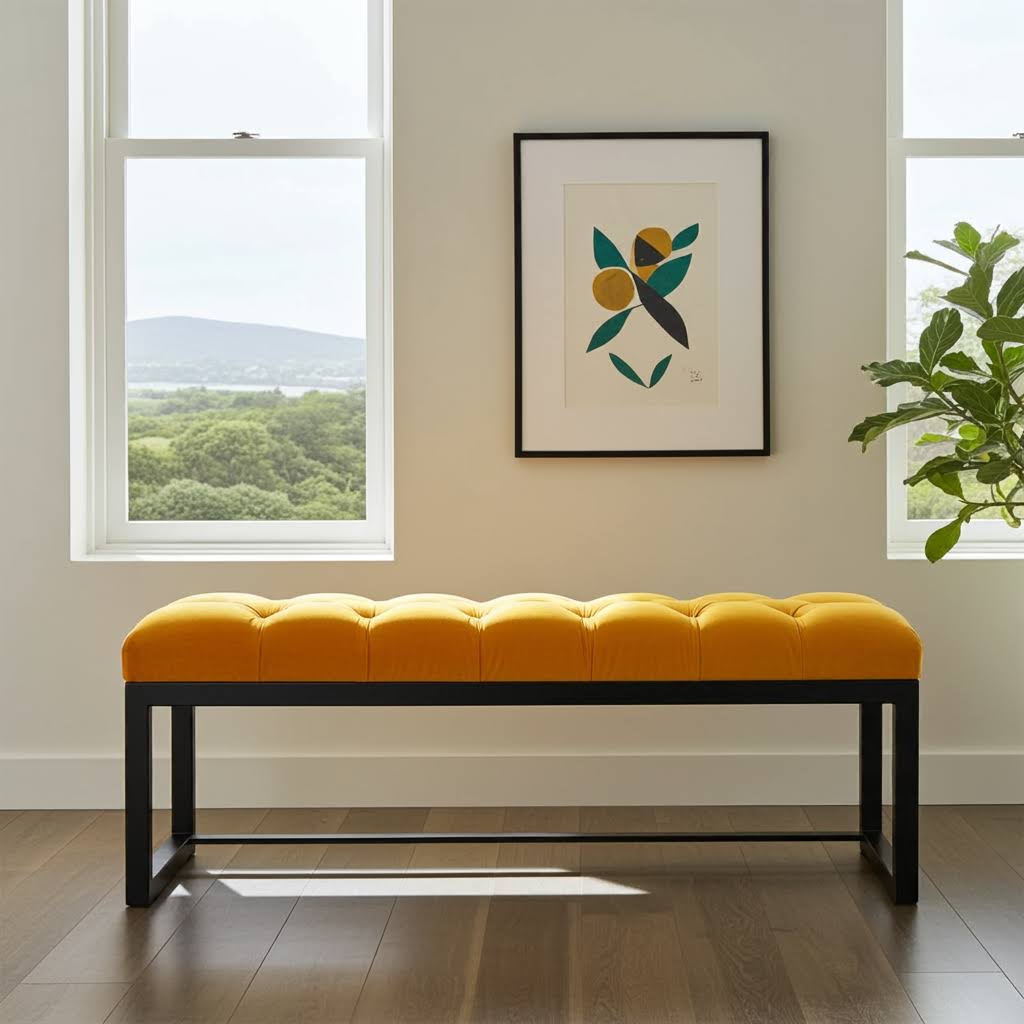 Crafted with premium yellow velvet, this bench provides a soft, inviting seating experience. The tufted design adds texture and visual interest, while the black powder-coated metal frame offers robust support and a sleek, modern look. With its compact dimensions—100cm long, 30cm wide, and 40/50cm high—it fits effortlessly into a variety of spaces, making it a versatile choice for Irish homes.