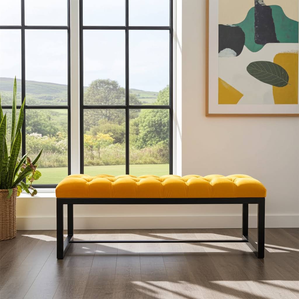 Bring a burst of sunshine to your interiors with the UrbanChic Velvet Bench 100x30cm. This stylish piece features a vibrant yellow tufted velvet seat and a contemporary black metal frame. Designed for both comfort and impact, it’s the perfect way to add a pop of colour and a touch of urban sophistication to hallways, bedrooms, or living spaces.