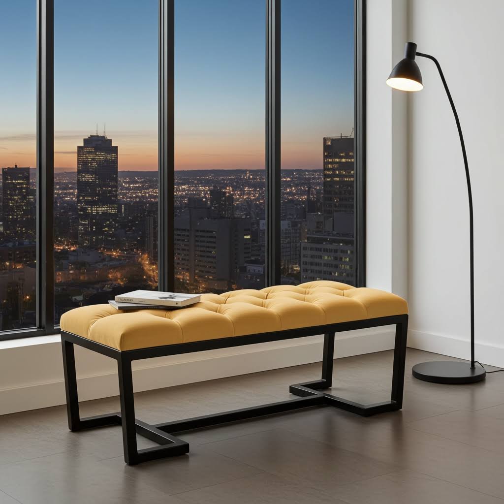 Brighten your space with the Zoe Metal-Framed Bench 100x40cm, featuring a striking mustard yellow tufted eco leather seat and a bold black powder-coated metal frame. As shown in the attached image, this bench blends contemporary style with comfort, making it a perfect fit for hallways, bedrooms, living rooms, or entryways. The geometric frame and vibrant upholstery create a standout piece that’s both functional and visually appealing.