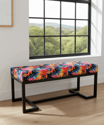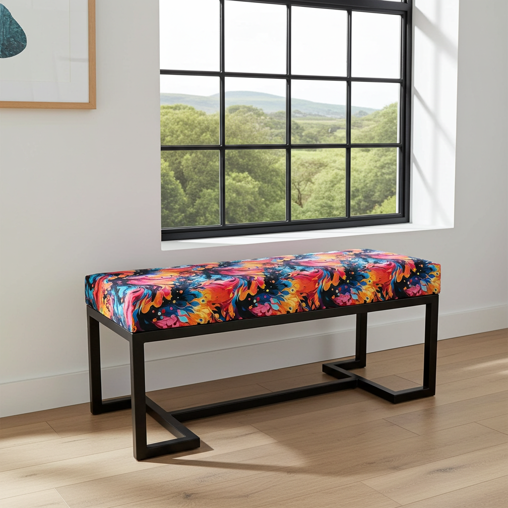 Brighten your home with the Zoe Metal-Framed Bench 100x40cm, featuring a striking multicolour abstract velvet seat and a sleek black powder-coated metal frame. The vibrant upholstery, with its swirling mix of blues, pinks, oranges, and yellows, creates a bold artistic statement, while the geometric black base adds a contemporary edge. This bench is perfect for hallways, bedrooms, living rooms, or any space that needs a pop of colour and creativity.