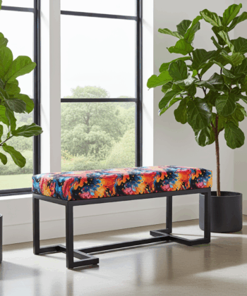 Handcrafted with premium velvet, the seat provides plush comfort and eye-catching style. The powder-coated black metal frame ensures stability, durability, and resistance to everyday wear. Measuring 100cm in length, 40cm in width, and 40/50cm in height, this bench fits seamlessly into both compact and spacious interiors. Moreover, the unique pattern transforms the bench into a functional piece of art, making it a true focal point in any room.