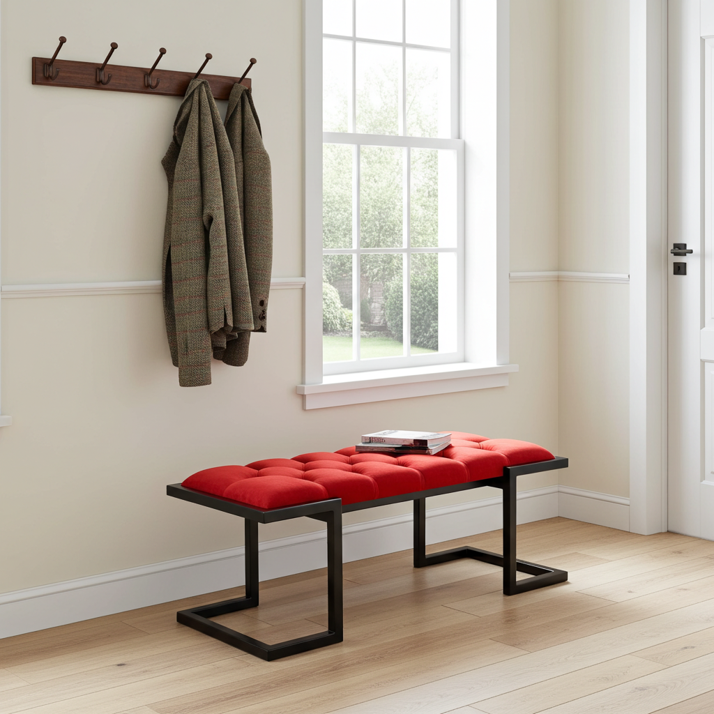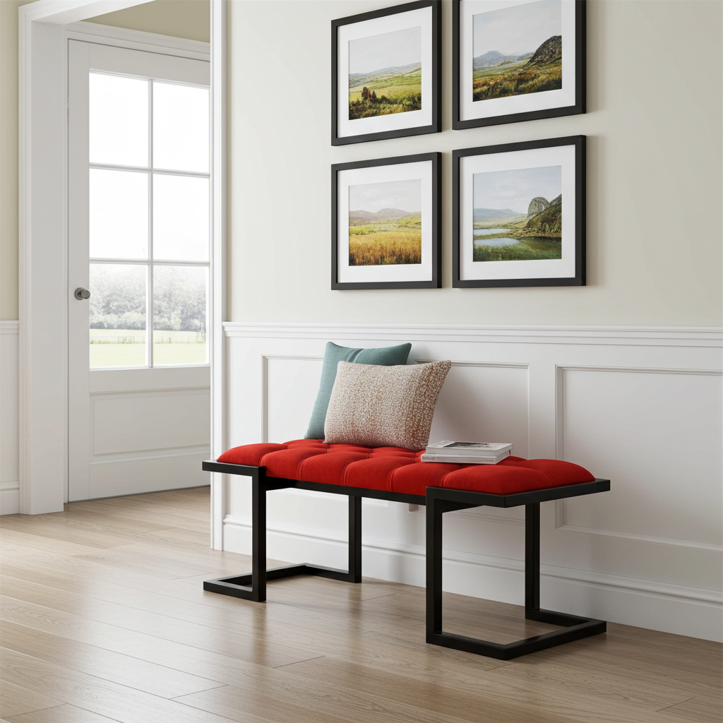 The sturdy black rectangular metal structure ensures exceptional stability and contemporary industrial styling. Meanwhile, the premium red velvet introduces sophisticated elegance and plush comfort. Additionally, the powder coating provides long-lasting protection against daily usage and environmental elements. Therefore, this bench represents a worthwhile investment for stylish Irish residences and refined living approaches.