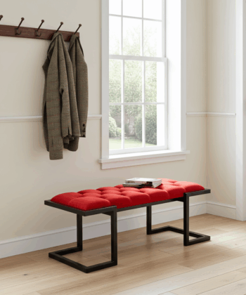 Elevate your interior design with PouffeLove’s magnificent metal-framed bench showcasing brilliant red velvet upholstery. Additionally, this outstanding piece features luxurious button-tufted craftsmanship across the seating area. Moreover, it’s meticulously manufactured for elegant Irish living spaces. Furthermore, the robust black powder-coated metal frame provides industrial-chic aesthetics to your environment.