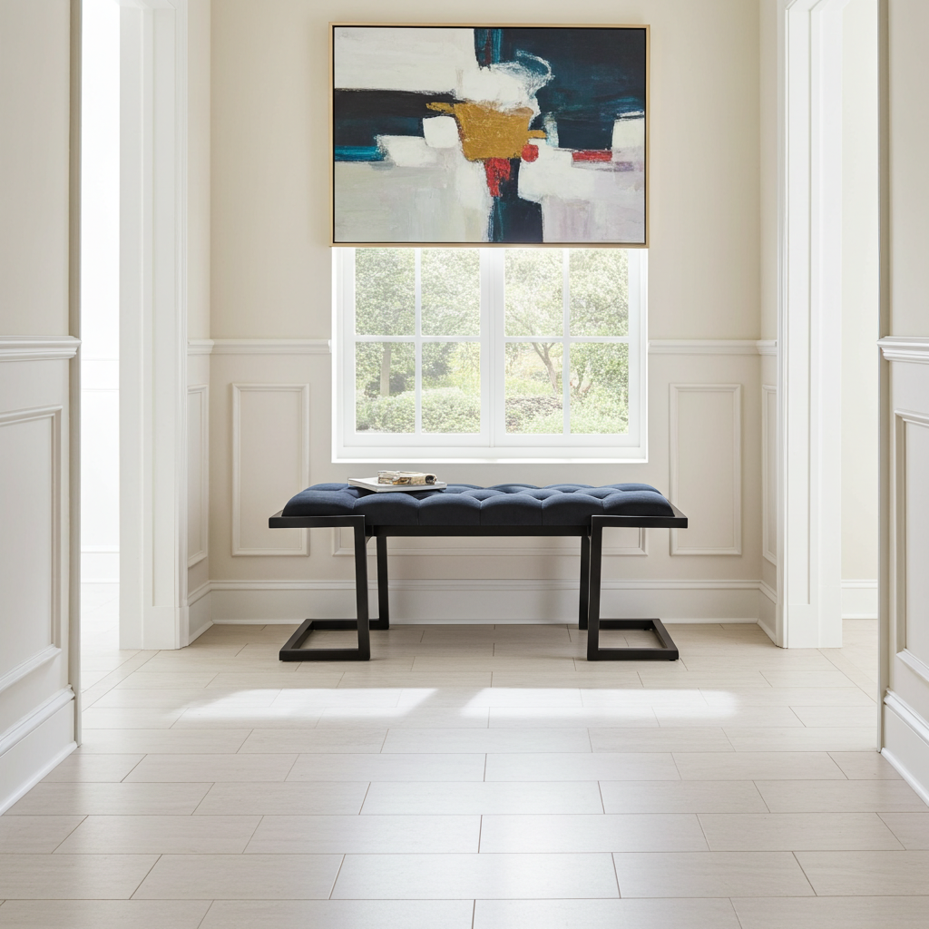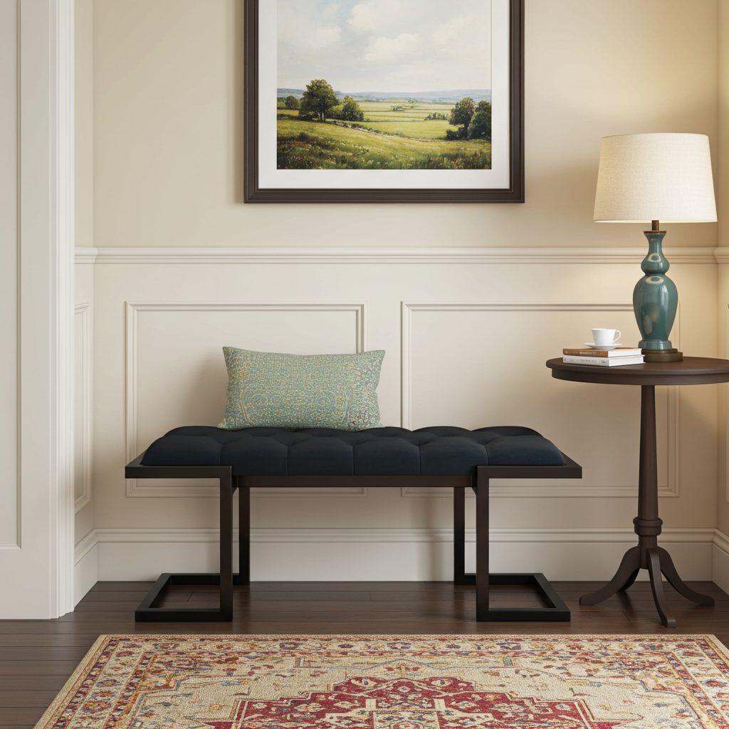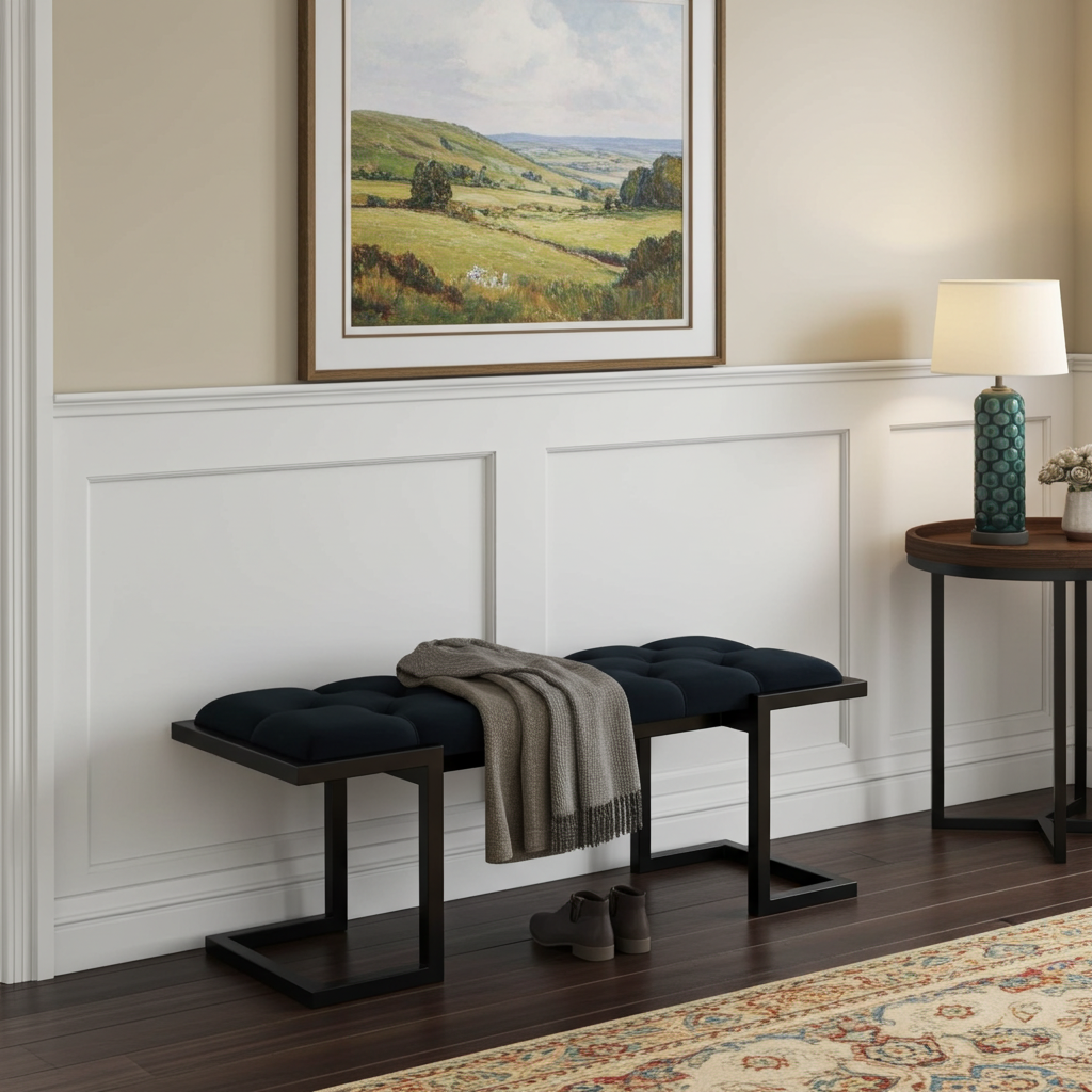 The bench displays sumptuous black velvet seating with exquisite button-tufted detailing throughout the surface. Subsequently, it provides exceptional comfort and luxurious aesthetic appeal. Meanwhile, the classic black colour adds timeless sophistication to your environment. Specifically, this versatile shade complements all interior design approaches seamlessly. Therefore, it creates an adaptable focal point for diverse decorative schemes.
