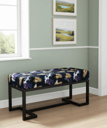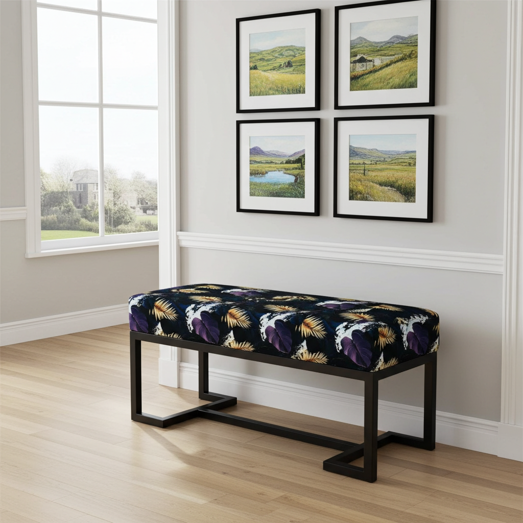 Bring a bold, artistic touch to your interior with the Zoe Metal-Framed Bench 100x40cm. This bench features a striking black velvet seat adorned with gold and purple botanical patterns, perfectly paired with a sleek black powder-coated metal frame12. The vivid upholstery and geometric base design make this bench a standout piece, ideal for hallways, bedrooms, living rooms, or any space that needs a statement accent.