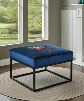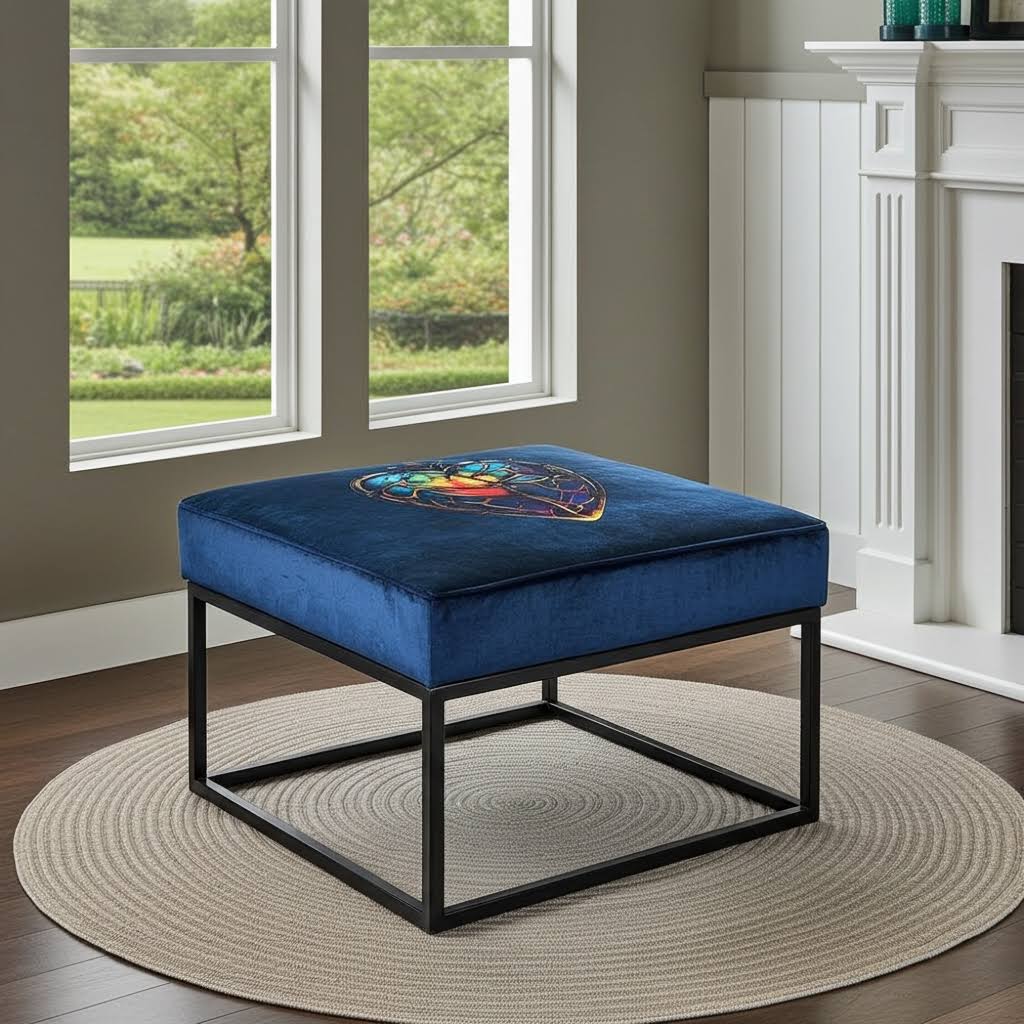 Bring artistic flair and modern comfort to your living space with the Artisan Square Navy Velvet Bench 60x60cm with Artistic Heart Motif and Black Metal Frame. This handcrafted bench features a plush navy velvet top, beautifully decorated with a vibrant stained-glass-inspired heart motif. Because of its bold design, it becomes a true statement piece for any room.