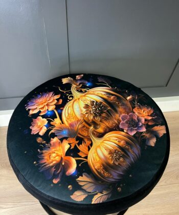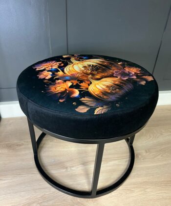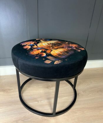 Handcrafted Designer Round Ottoman Featuring Abstract Coral Artistry with Navy Velvet Trim – Contemporary Art Furniture for Creative Irish Homes