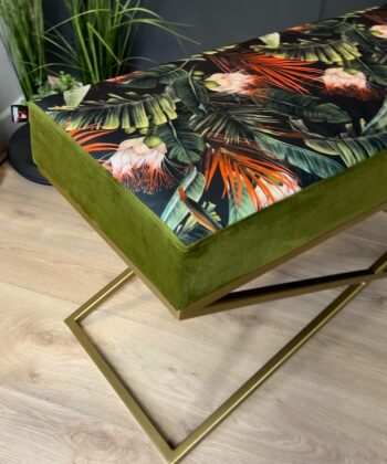 This bench combines striking botanical prints and lush green velvet with a contemporary gold frame, making it a standout piece in any room. The premium materials and handmade construction ensure both comfort and longevity. Add it to your space for a fresh, modern look and a touch of luxury.