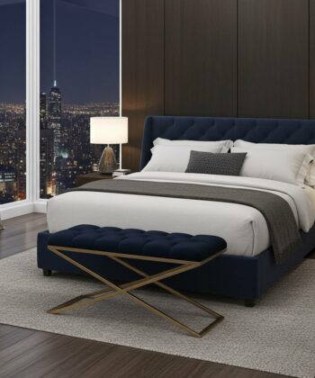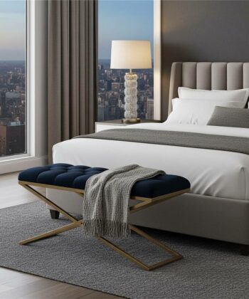 Light Grey Tufted Bench for Irish Homes – Antique Gold Metal Frame