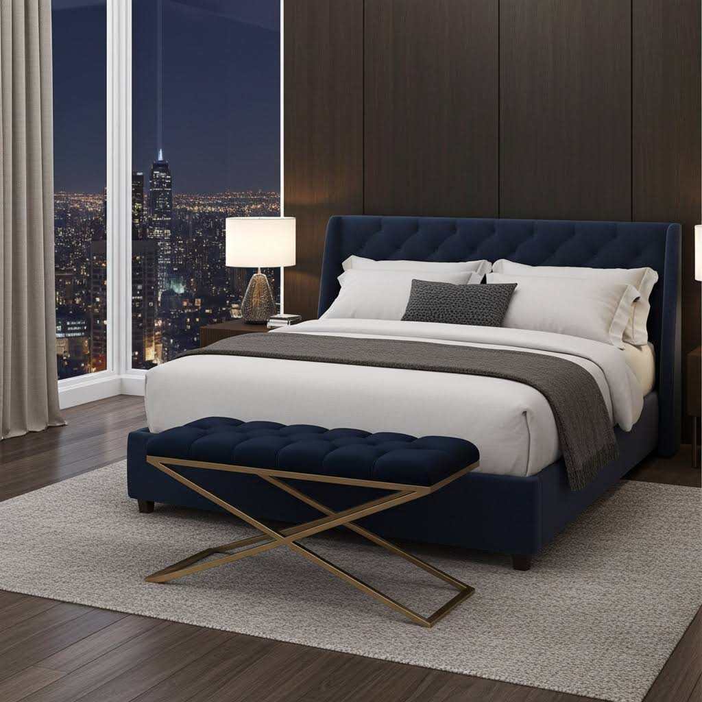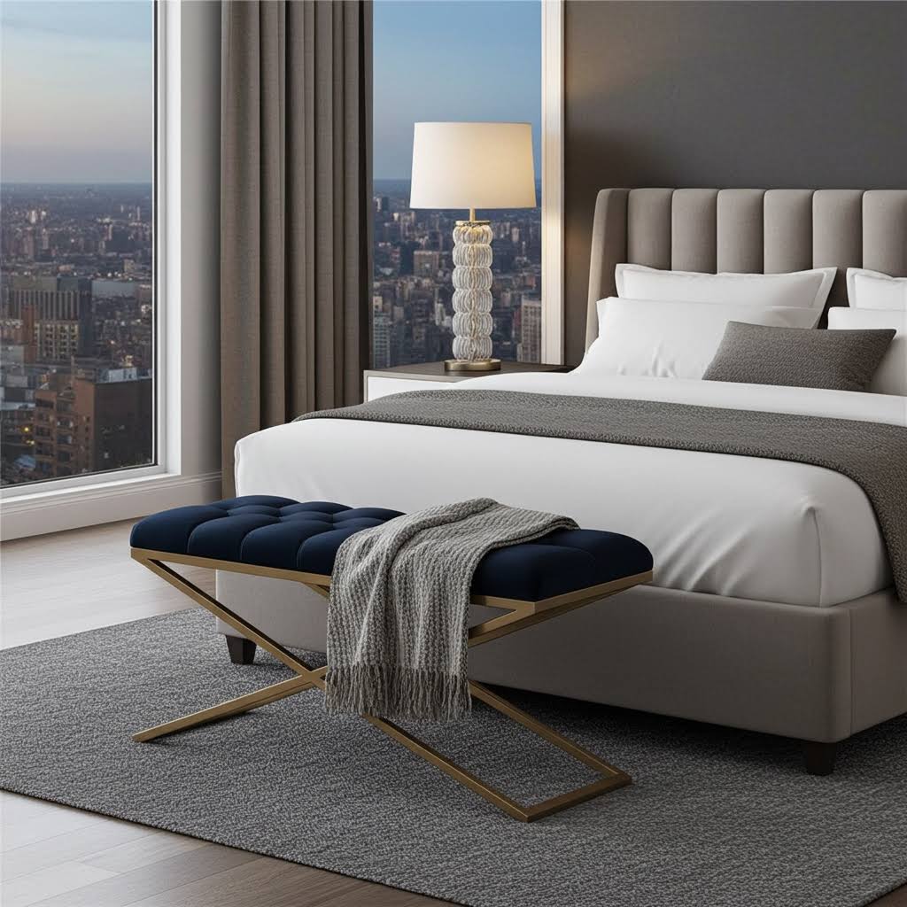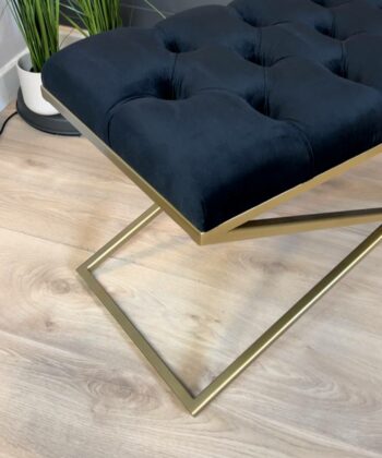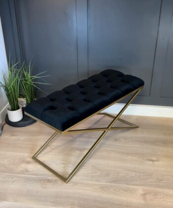 Enhance your space with this handmade light grey tufted bench. It features an antique gold powder-coated metal frame and a unique single X design. The bench is ideal for hallways, bedrooms, or living rooms. Its compact size offers both style and comfort. Dimensions: 100x40x40/50cm. The premium tufted upholstery feels luxurious, and the sturdy frame ensures lasting quality.
