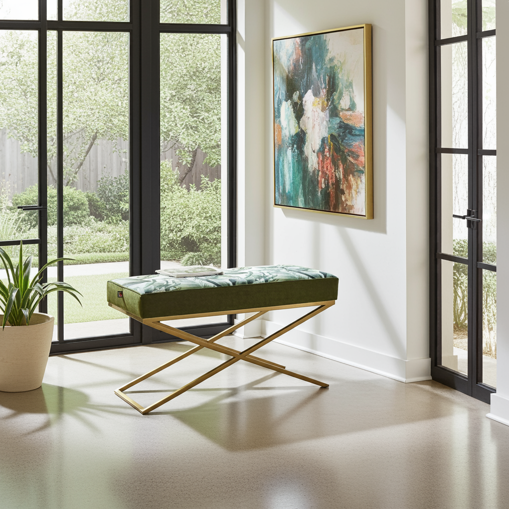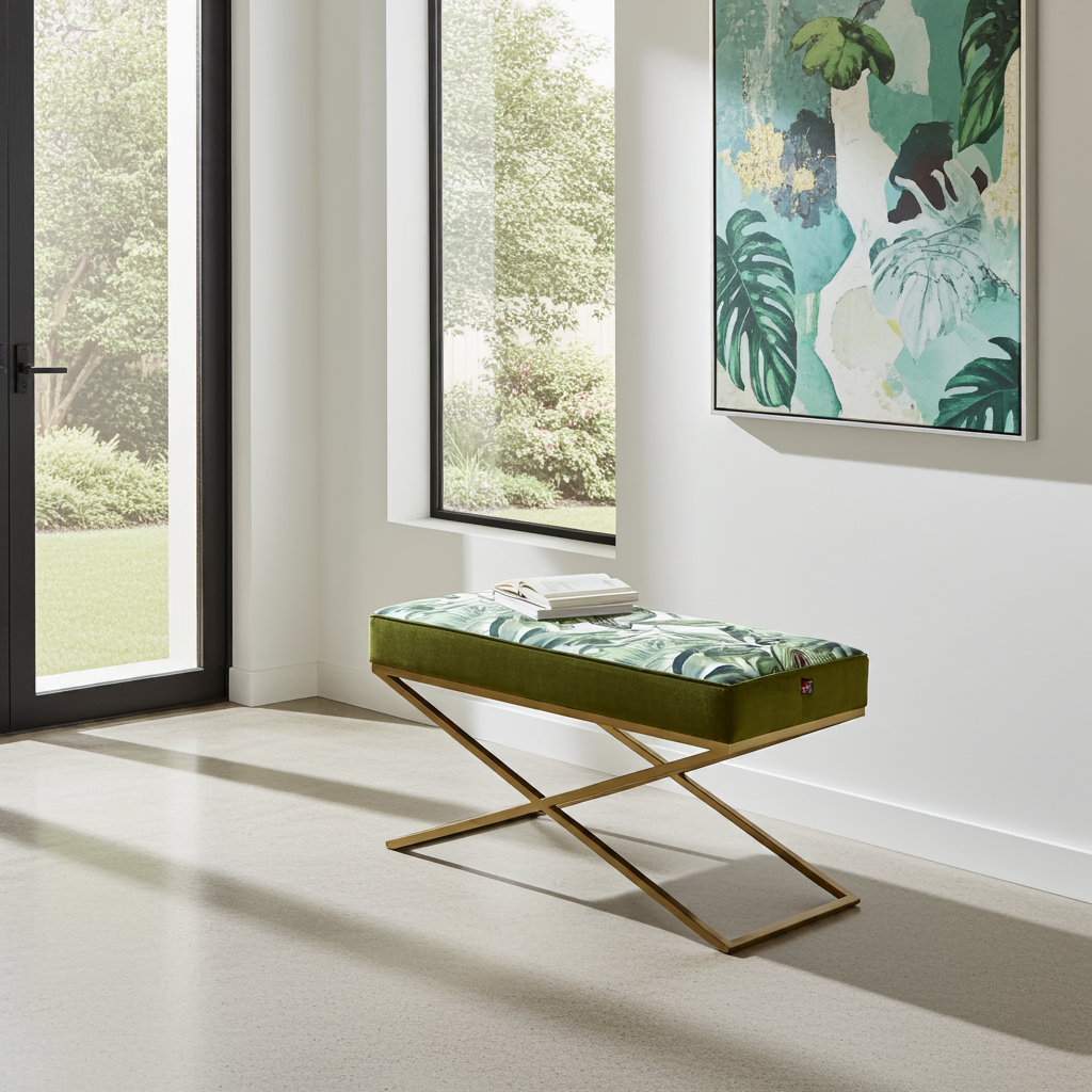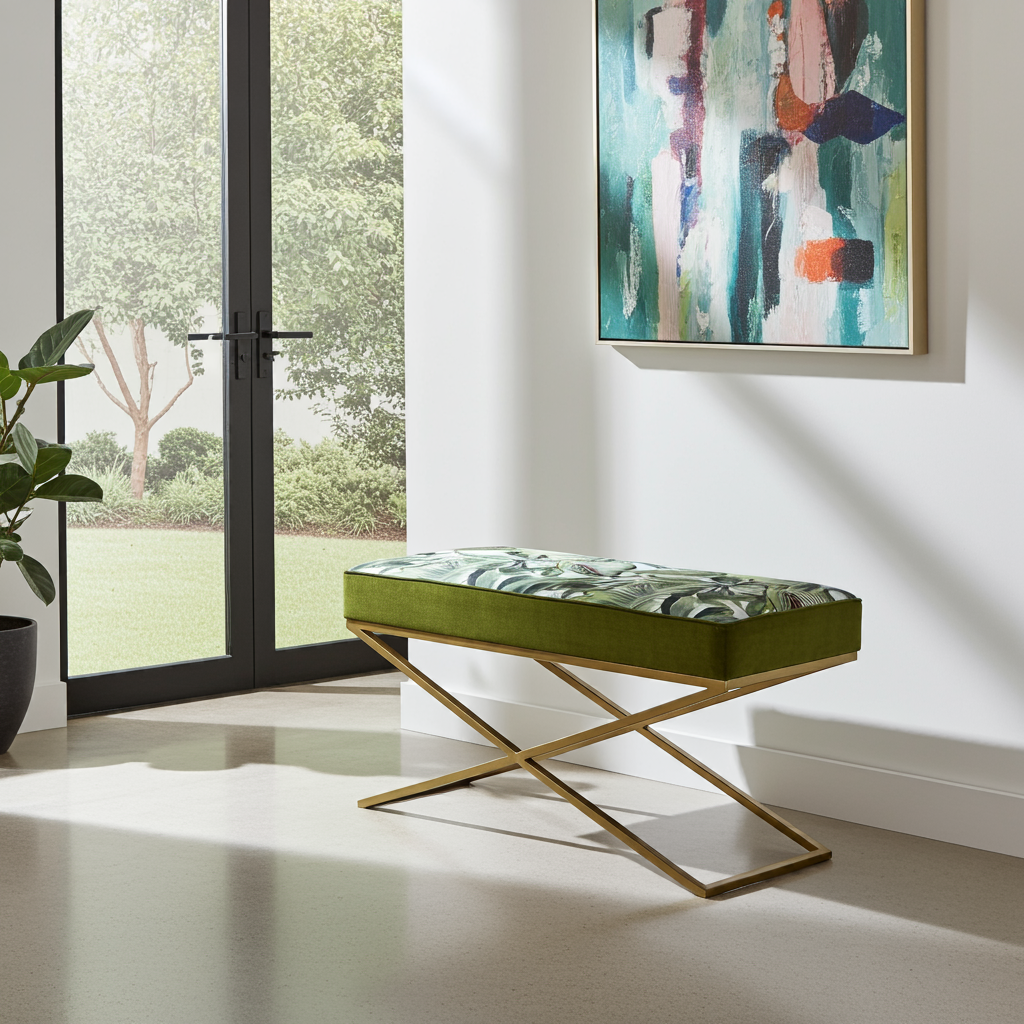 Metal-Framed Bench: Botanical Velvet and Gold X-Frame for Modern Irish Interiors