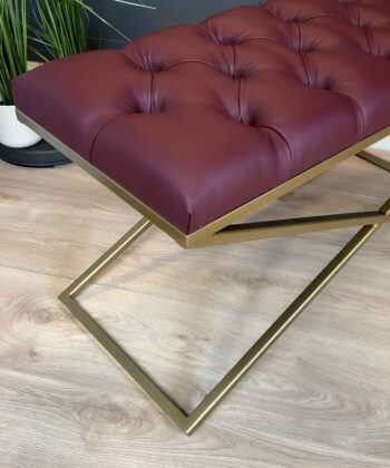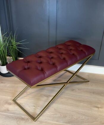 Premium Handcrafted Burgundy Eco Leather Bench with Elegant Antique Gold X-Frame Design for Irish Homes