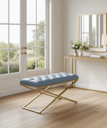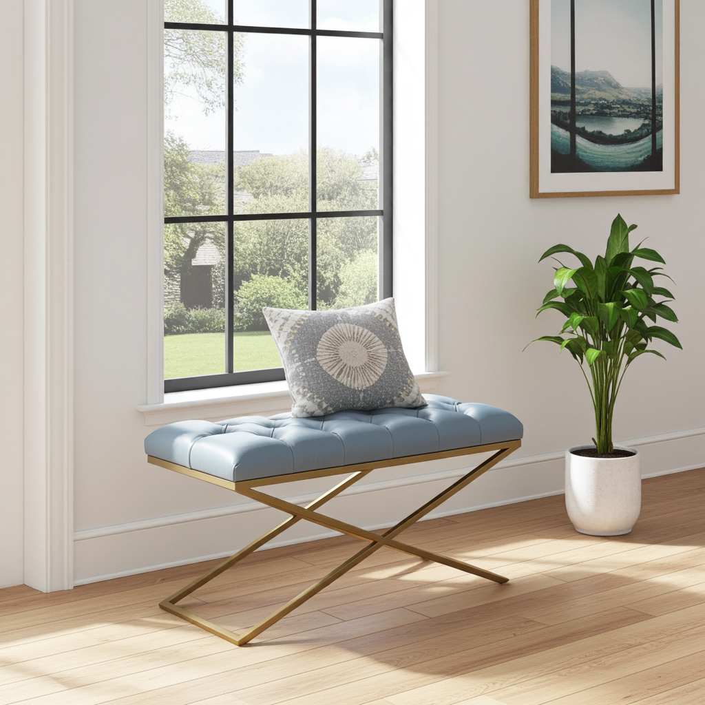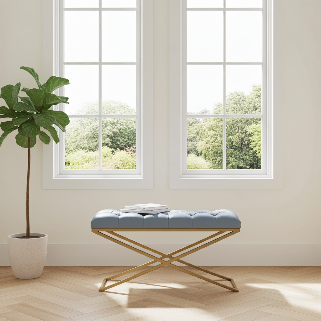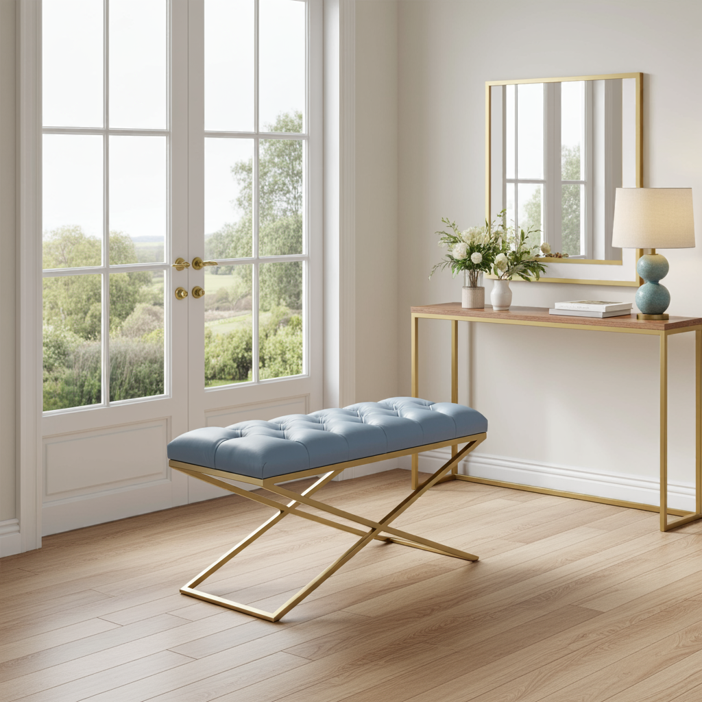 Add a sophisticated touch to your home with the Metal-Framed Bench 100x40cm Single X Style, featuring a light grey tufted seat and a striking antique gold powder-coated metal frame. This handmade bench combines comfort, durability, and a contemporary single X design, making it ideal for hallways, bedrooms, living rooms, or any space that needs a stylish accent. The light grey upholstery brings a fresh, modern look, while the gold frame adds a luxurious finish.