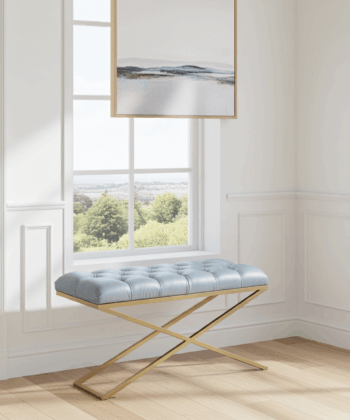 This bench is crafted with high-quality tufted upholstery in a soft light grey shade, offering a plush and inviting seat. The antique gold powder-coated metal frame ensures strength, stability, and resistance to daily wear. Its dimensions—100cm in length, 40cm in width, and 40/50cm in height—make it suitable for both spacious and compact rooms. The sturdy construction guarantees long-lasting use and reliable support. Whether you need extra seating or a decorative accent, this bench fits a wide range of interior styles and brings a touch of elegance to your home.
