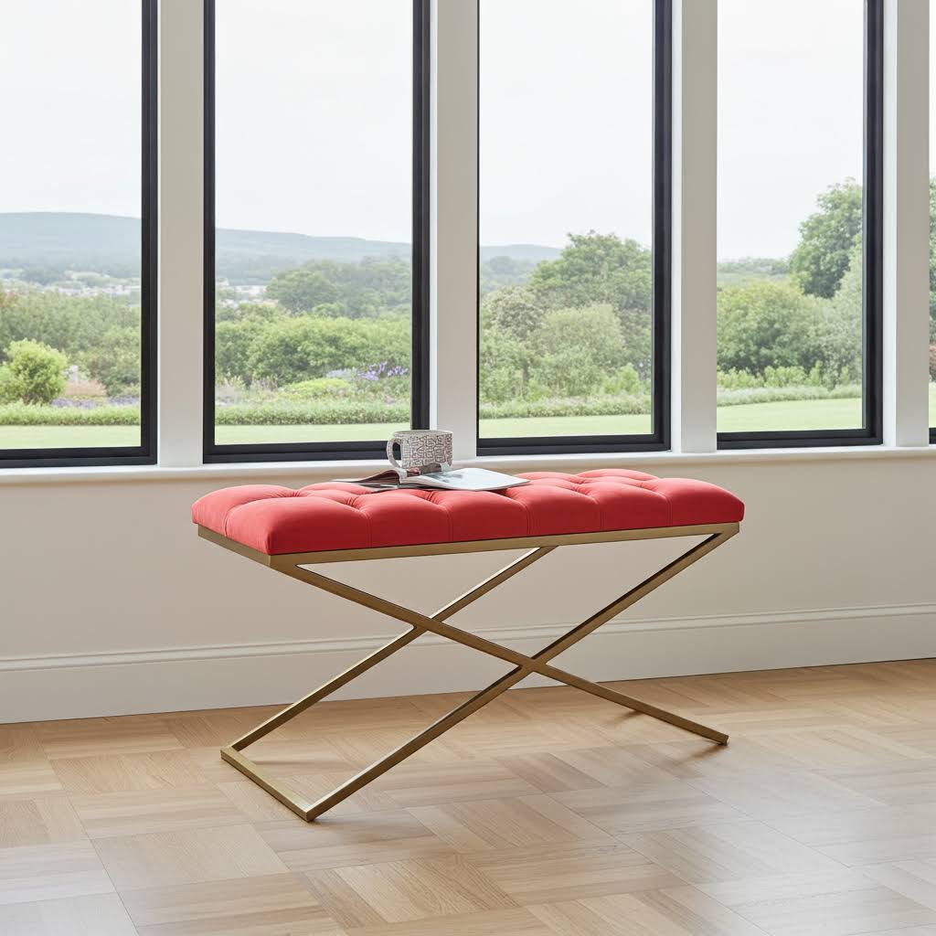 Premium Handcrafted Red Velvet Bench with Elegant Gold X-Frame Design for Irish Homes