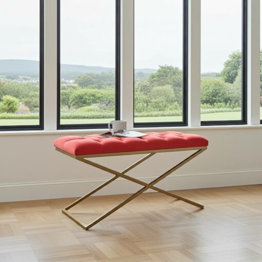 The robust gold X-frame provides exceptional stability and luxury aesthetics. Meanwhile, the premium red velvet adds sophisticated comfort and visual drama. Additionally, the powder-coated finish ensures long-lasting protection against daily wear. Therefore, this bench becomes a lasting investment for stylish Irish homes and lifestyles.
