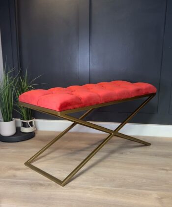 Transform your living space with PouffeLove’s stunning metal-framed bench featuring luxurious red velvet upholstery. Additionally, this premium piece showcases an elegant gold powder-coated X-frame design. Moreover, it’s expertly handcrafted for contemporary Irish interiors. Furthermore, the vibrant red colour adds bold sophistication and warmth to any room.