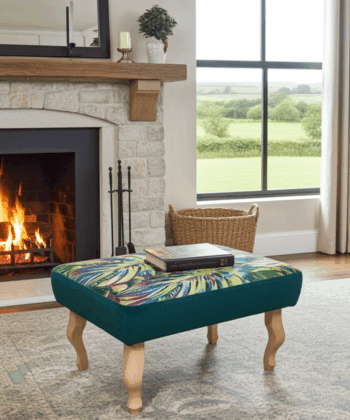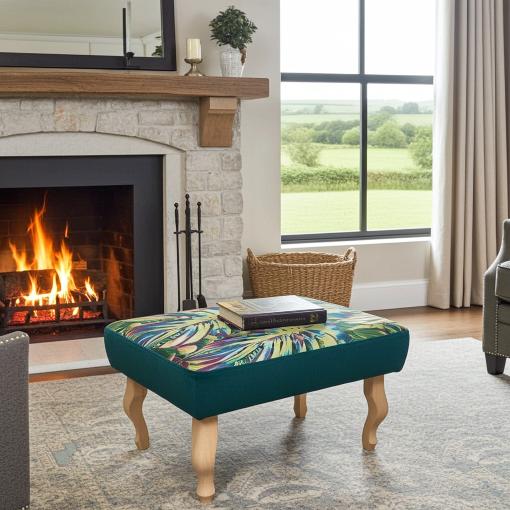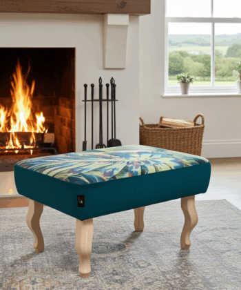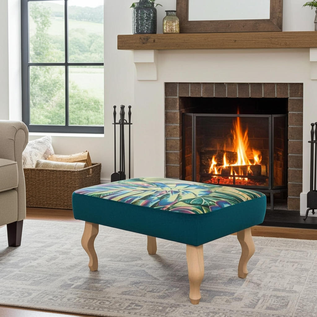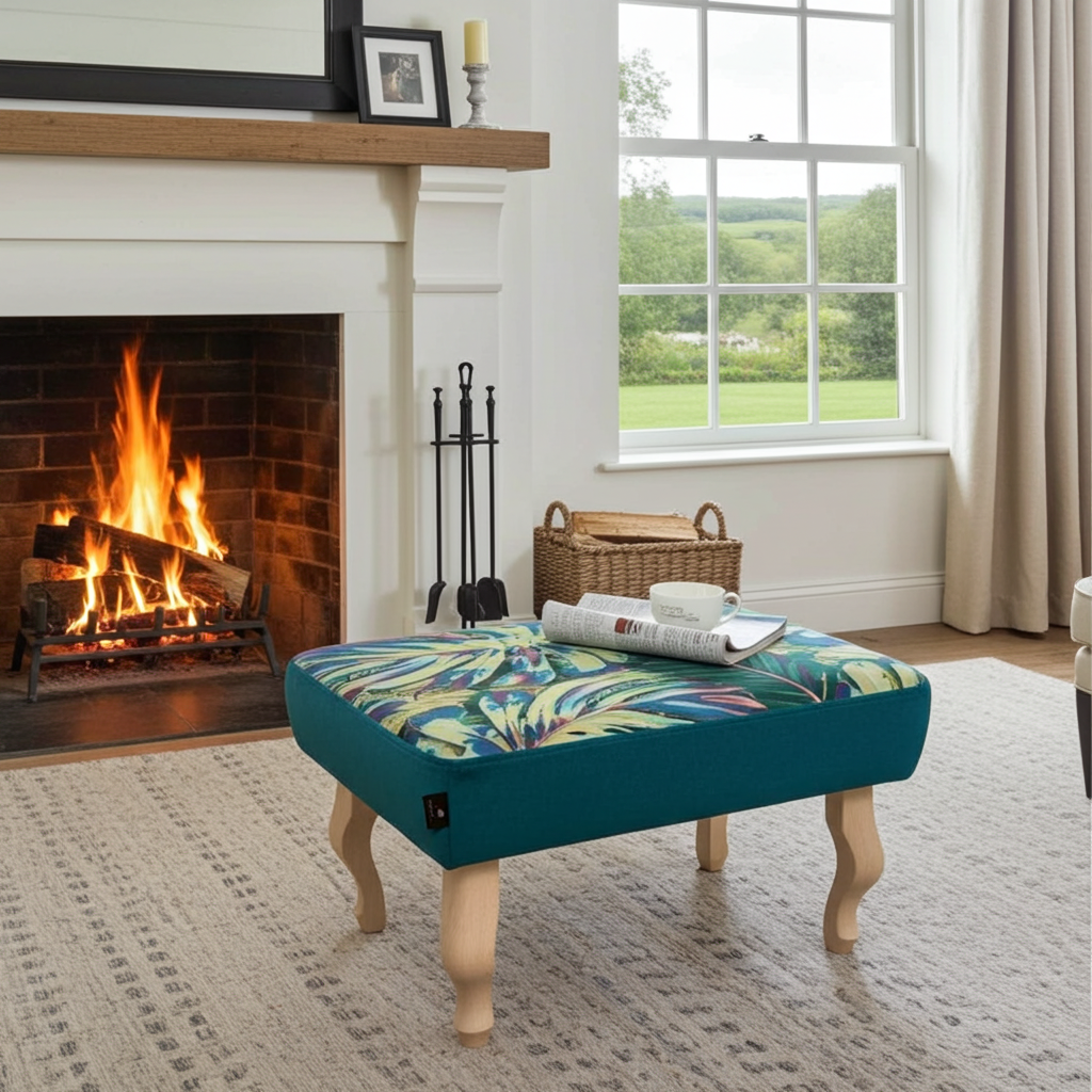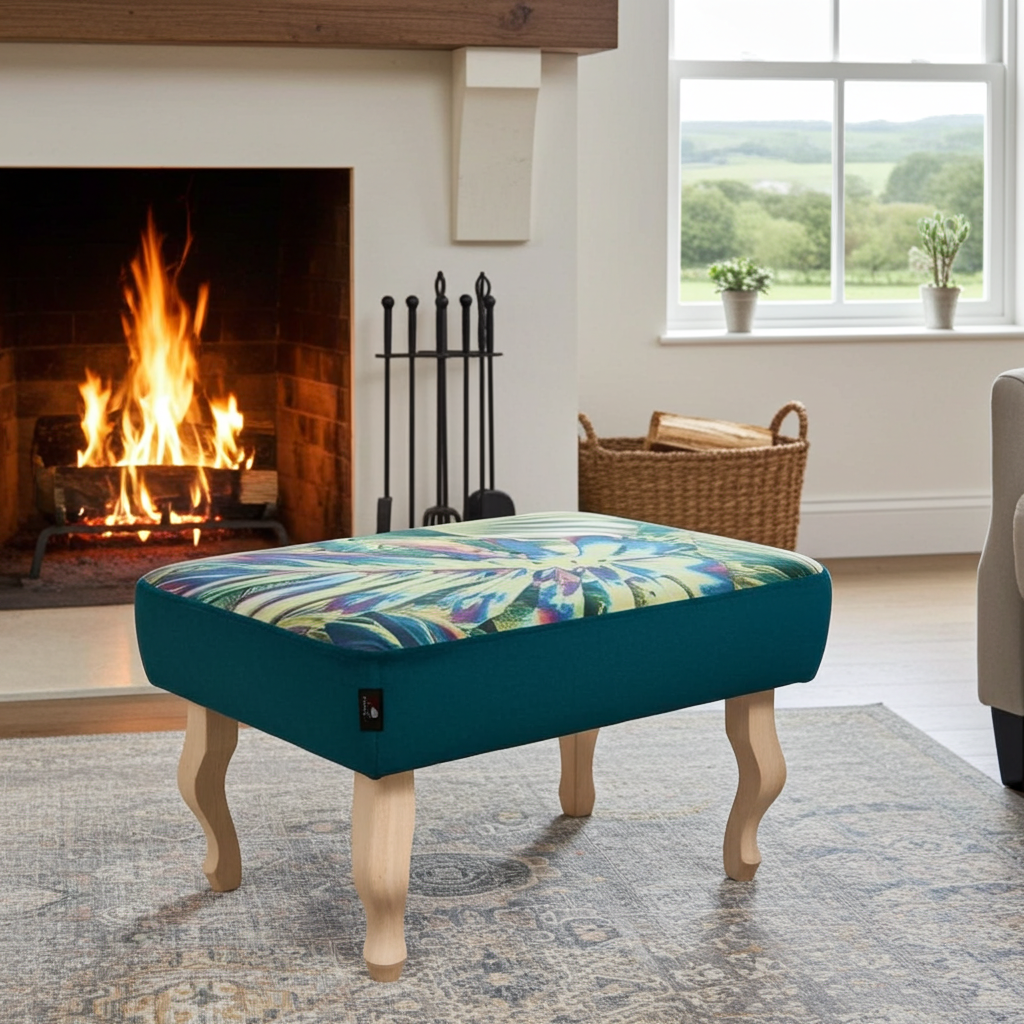 Tropical monstera velvet footstool with teal sides and curved beech legs. Statement botanical pouffe, customisable for your Irish home.
