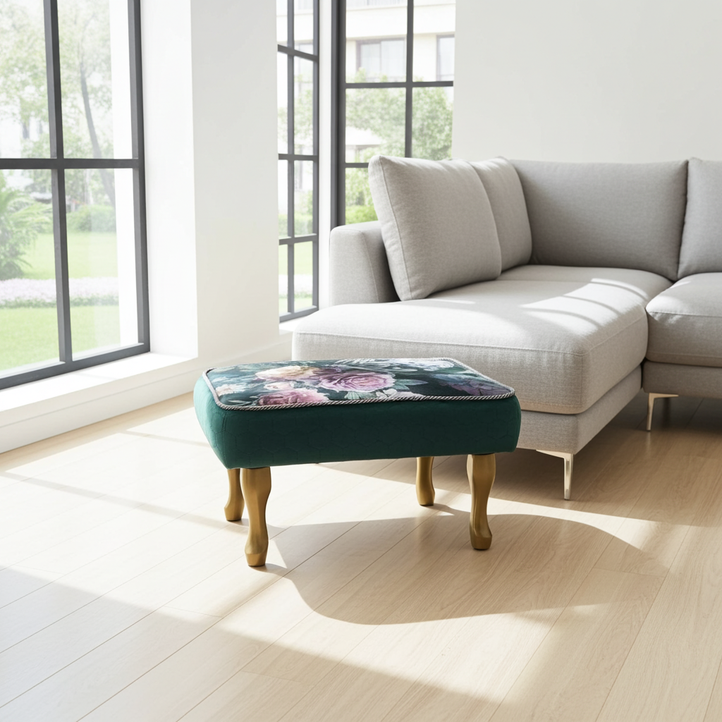 The footstool displays sumptuous dark velvet with beautiful pink and purple rose patterns creating elegant contrast and timeless appeal. Subsequently, it delivers exceptional comfort and refined aesthetic sophistication. Meanwhile, the rich dark background with vibrant blooms adds depth and romance to your space. Specifically, this classic floral design harmonises perfectly with both traditional and contemporary interior schemes. Therefore, it establishes a graceful accent piece for diverse decorating approaches.