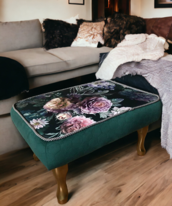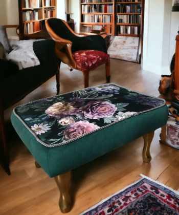Transform your living space with this magnificent dark floral footstool featuring luxurious velvet upholstery with stunning pink rose motifs. Additionally, this exceptional piece showcases premium velvet fabric with romantic botanical patterns throughout. Moreover, it’s expertly handcrafted for sophisticated Irish interiors. Furthermore, the gleaming golden metal legs add contemporary luxury and warmth to any room.