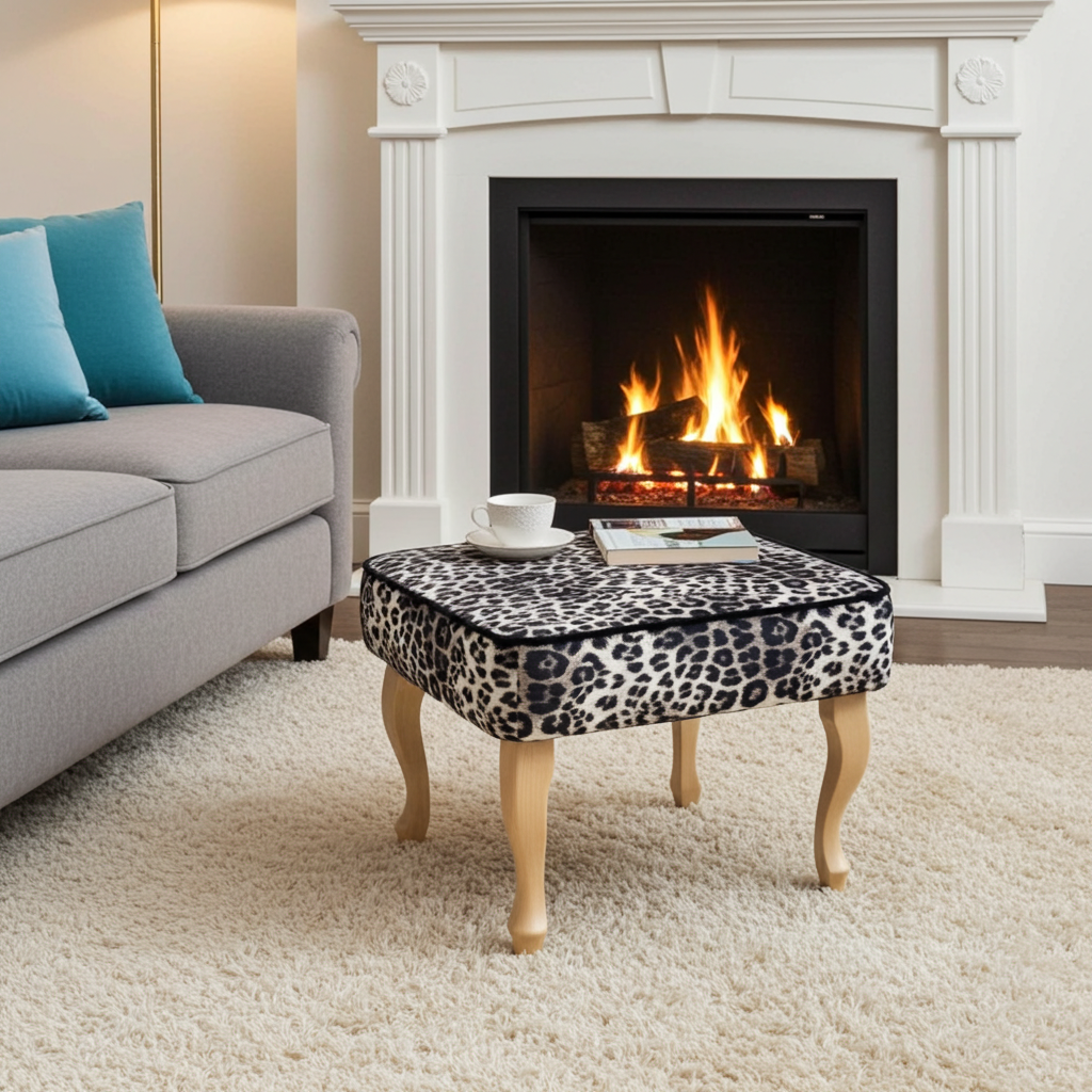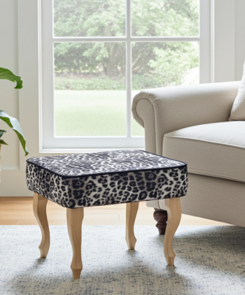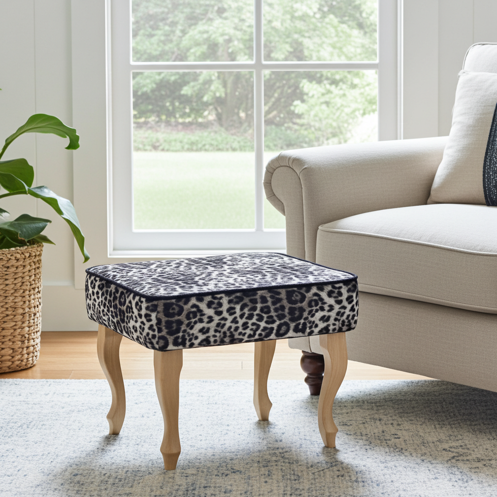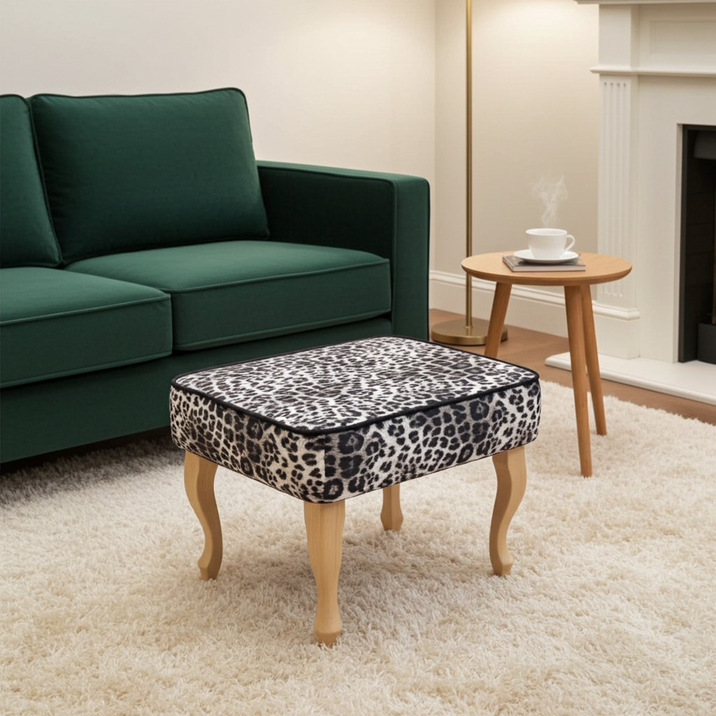 The footstool presents luxurious snake print velvet with intricate black and white patterns creating dramatic texture and visual sophistication. Subsequently, it delivers exceptional comfort and bold aesthetic impact. Meanwhile, the monochromatic colour scheme adds versatility and modern elegance to your space. Specifically, this distinctive animal print design harmonises beautifully with both contemporary and eclectic interior schemes. Therefore, it establishes a striking accent piece for adventurous decorating approaches.