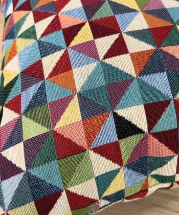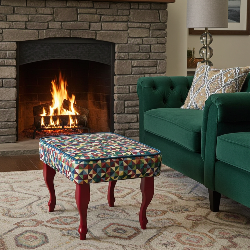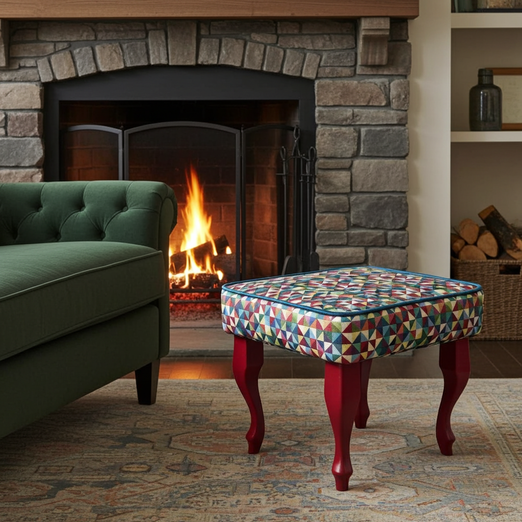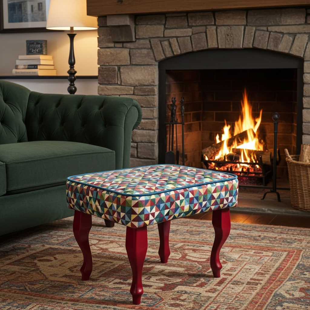 Geo Carnival Velvet Footstool – Multicolour Geometric Pouffe with Customisable Legs, Handcrafted for Stylish Irish Interiors