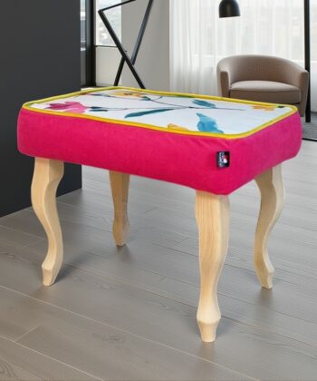 Fuchsia Bloom Velvet Footstool – Pink Watercolour Pouffe with Yellow Trim and Natural Curved Beech Legs, Handcrafted for Irish Homes