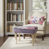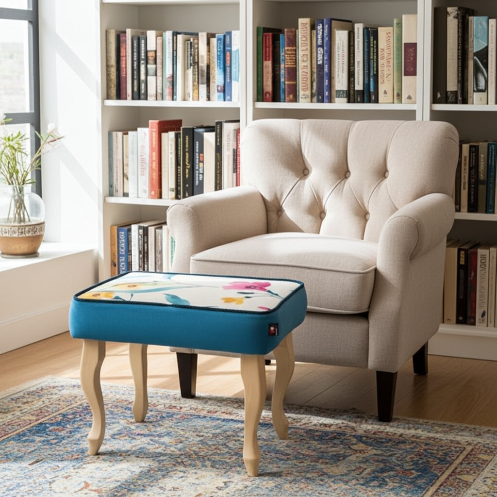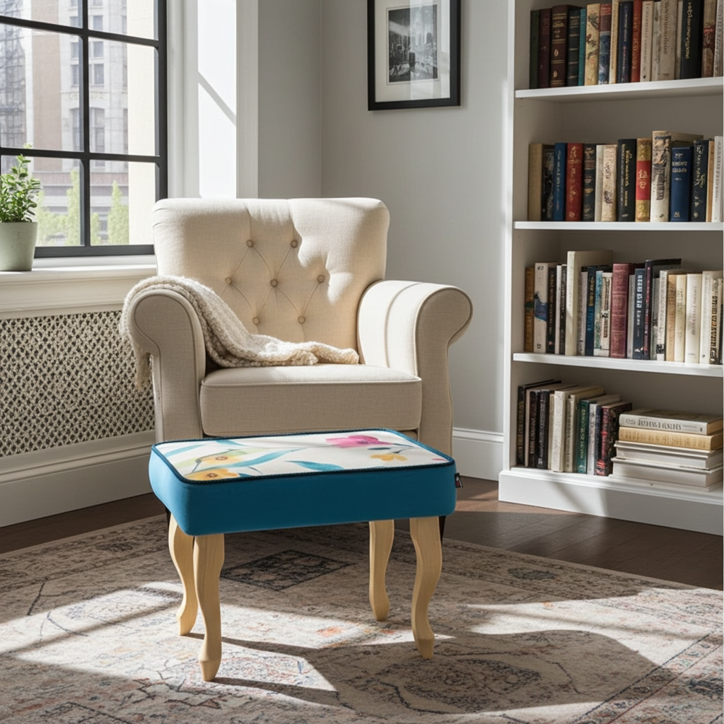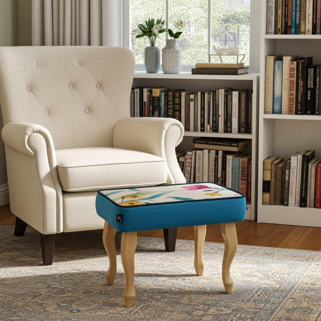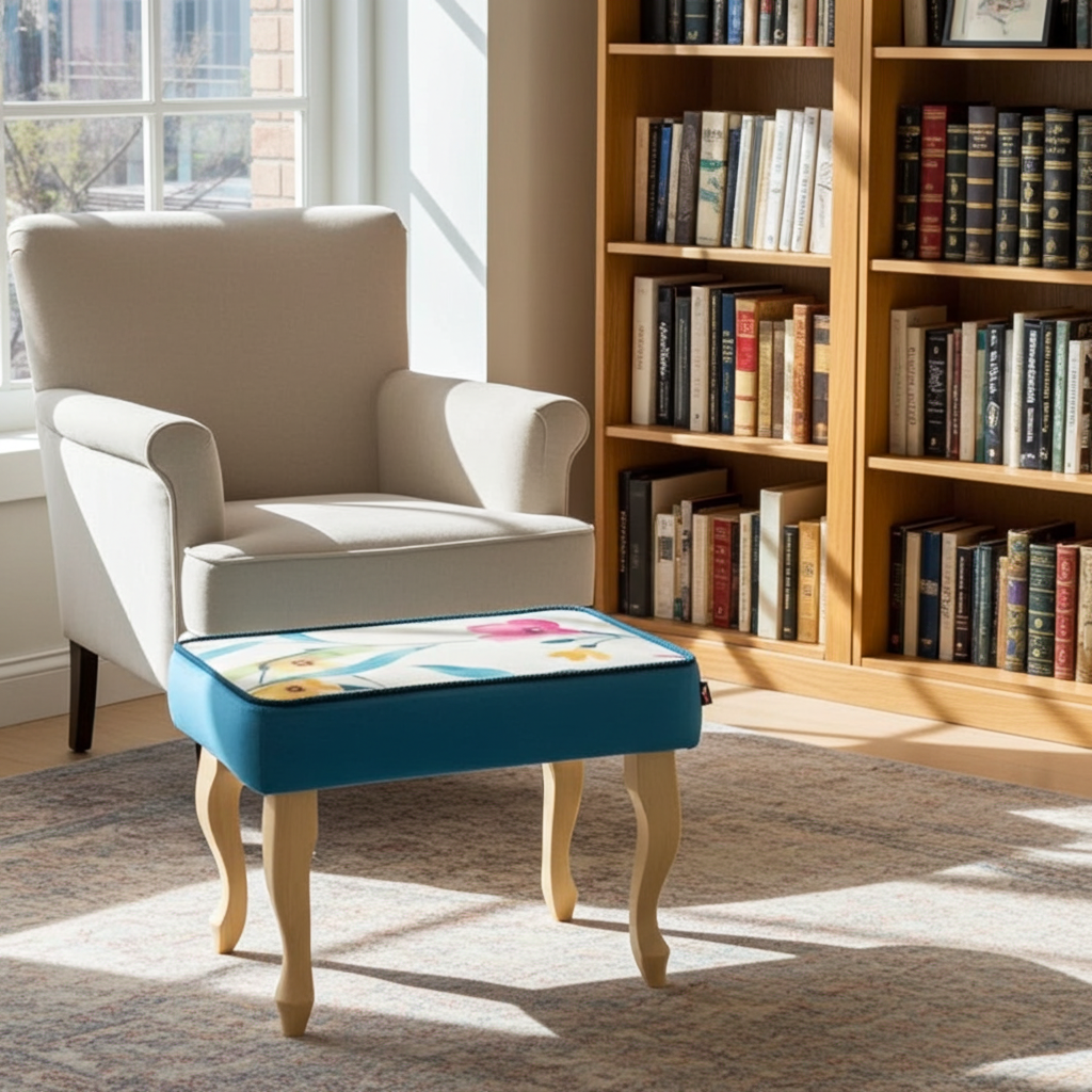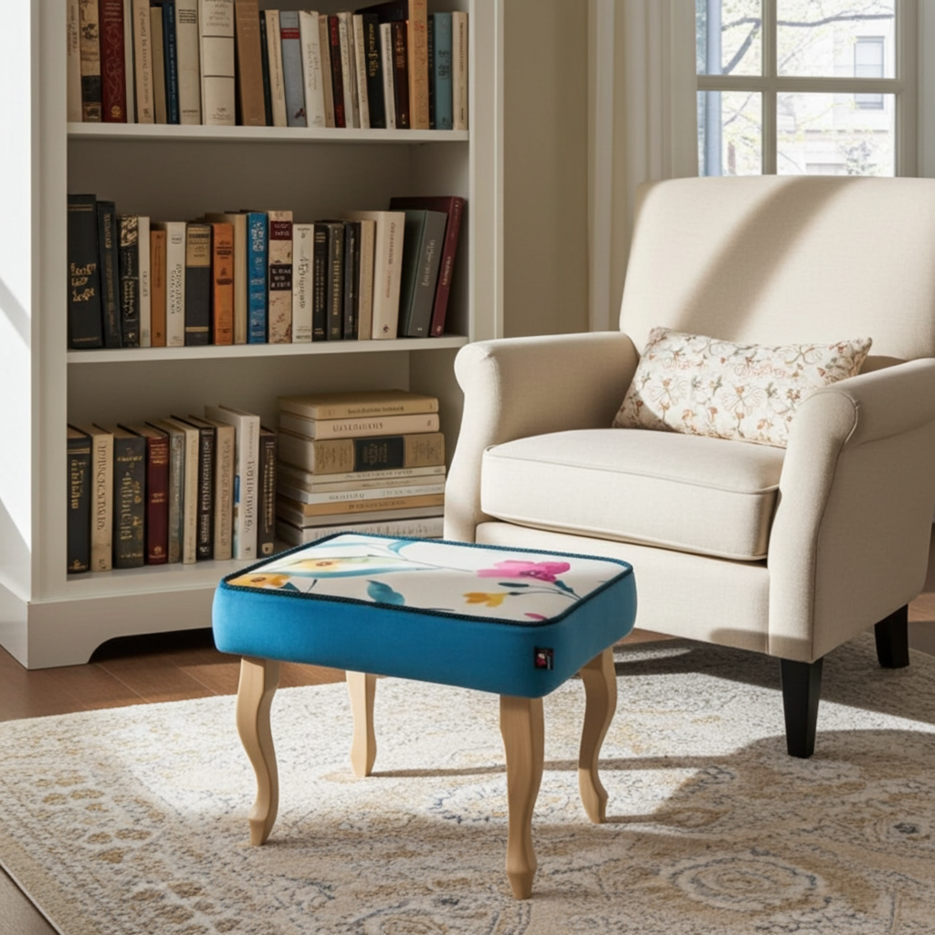 Sky Blue Floral Velvet Footstool 60x40cm with Printed Top and Curved Wooden Legs for Cosy Living Rooms and Bedrooms