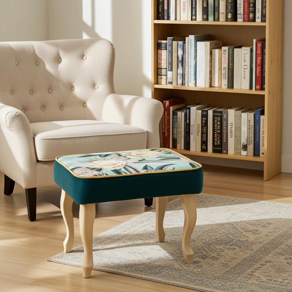 Elevate your interior with this unique, upholstered footstool, meticulously handmade for exceptional quality and durability. The seat measures 60x40cm and stands 40cm high, upholstered in premium velvet fabric. The top boasts a vibrant, floral design bordered by a golden trim, while the deep green velvet sides add richness and depth. Resting on beautifully shaped, natural beech wood cabriole legs, this footstool blends classic elegance with modern flair.