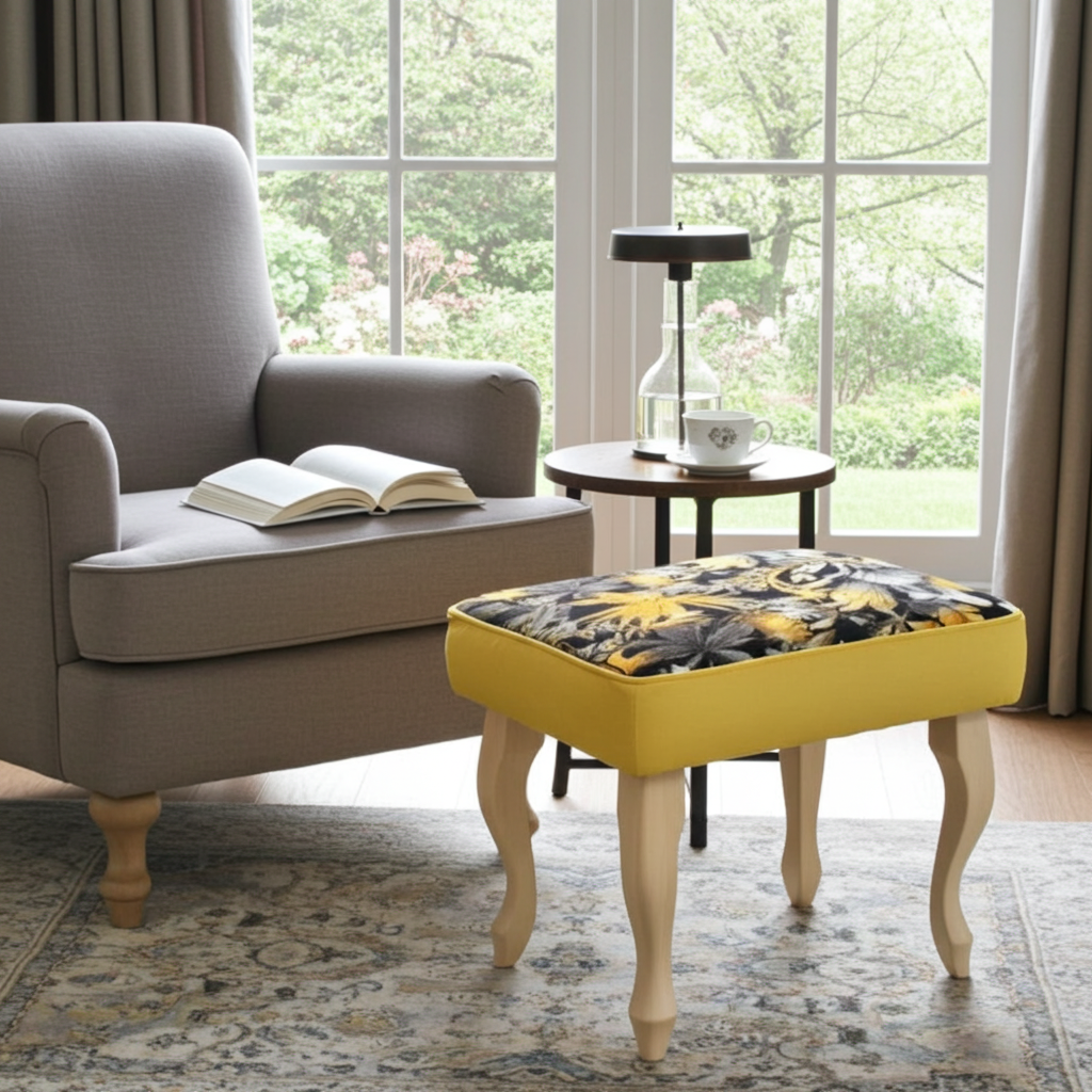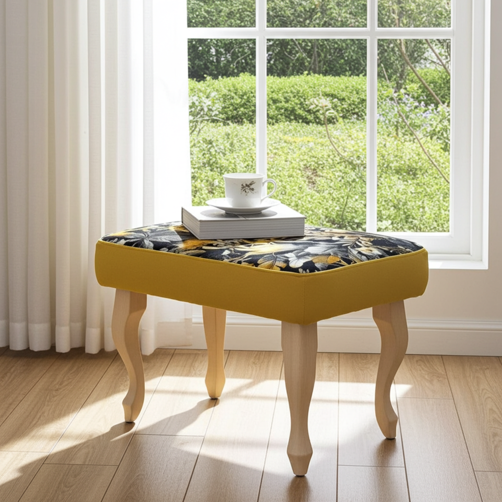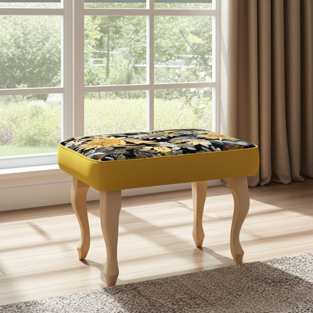 The Verona Velvet Footstool 60×40 cm stands out with its bold yellow base and striking patterned top, making it a perfect accent for any modern or classic Irish interior. Handcrafted with meticulous attention to detail, this footstool features high-quality velvet upholstery and solid lacquered beech wood legs, ensuring both durability and a luxurious feel. Its dimensions—60 x 40 cm with a height of 40 cm—make it versatile for use as a footrest, extra seat, or decorative piece in your living room, bedroom, or hallway2.