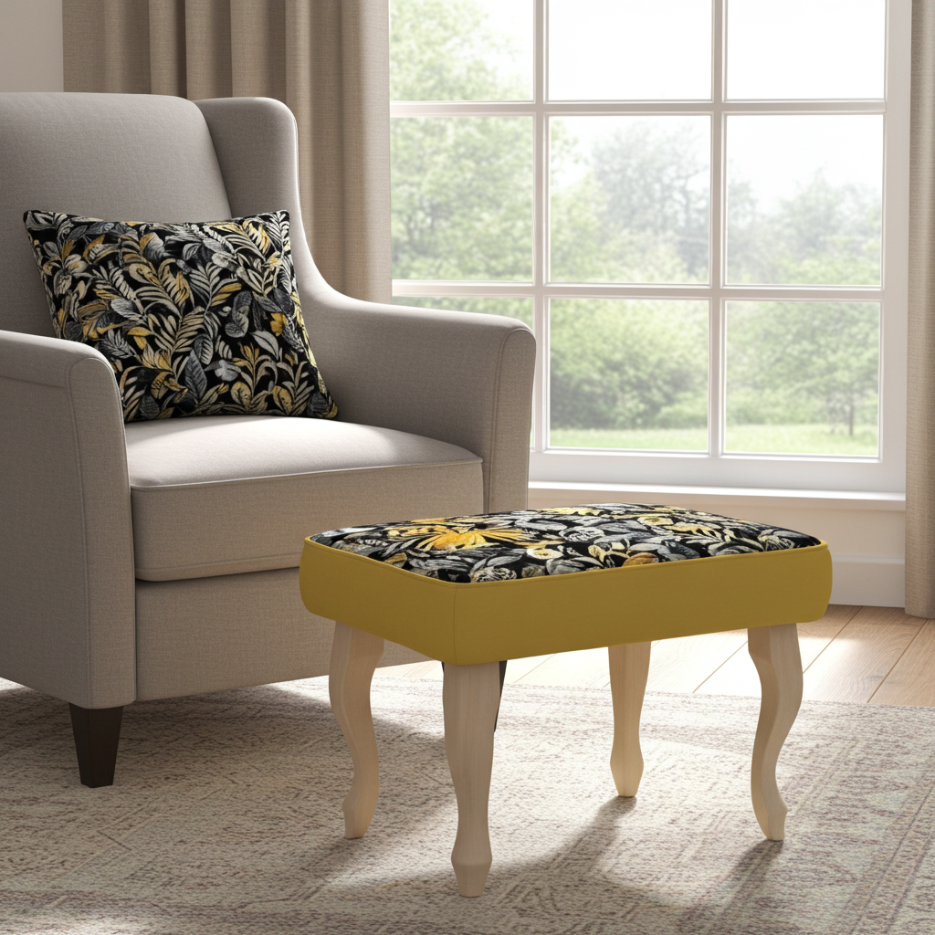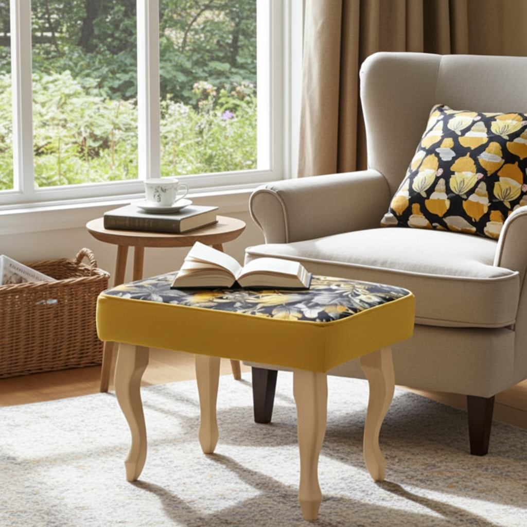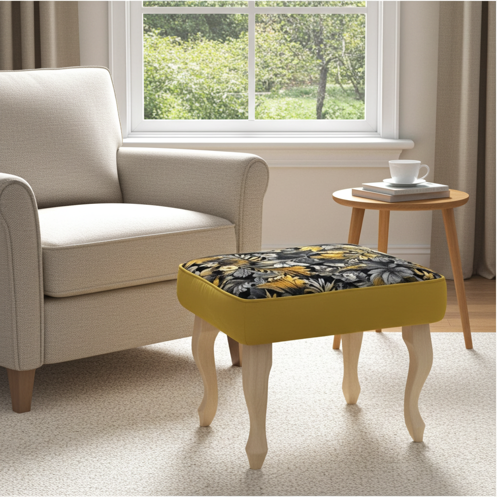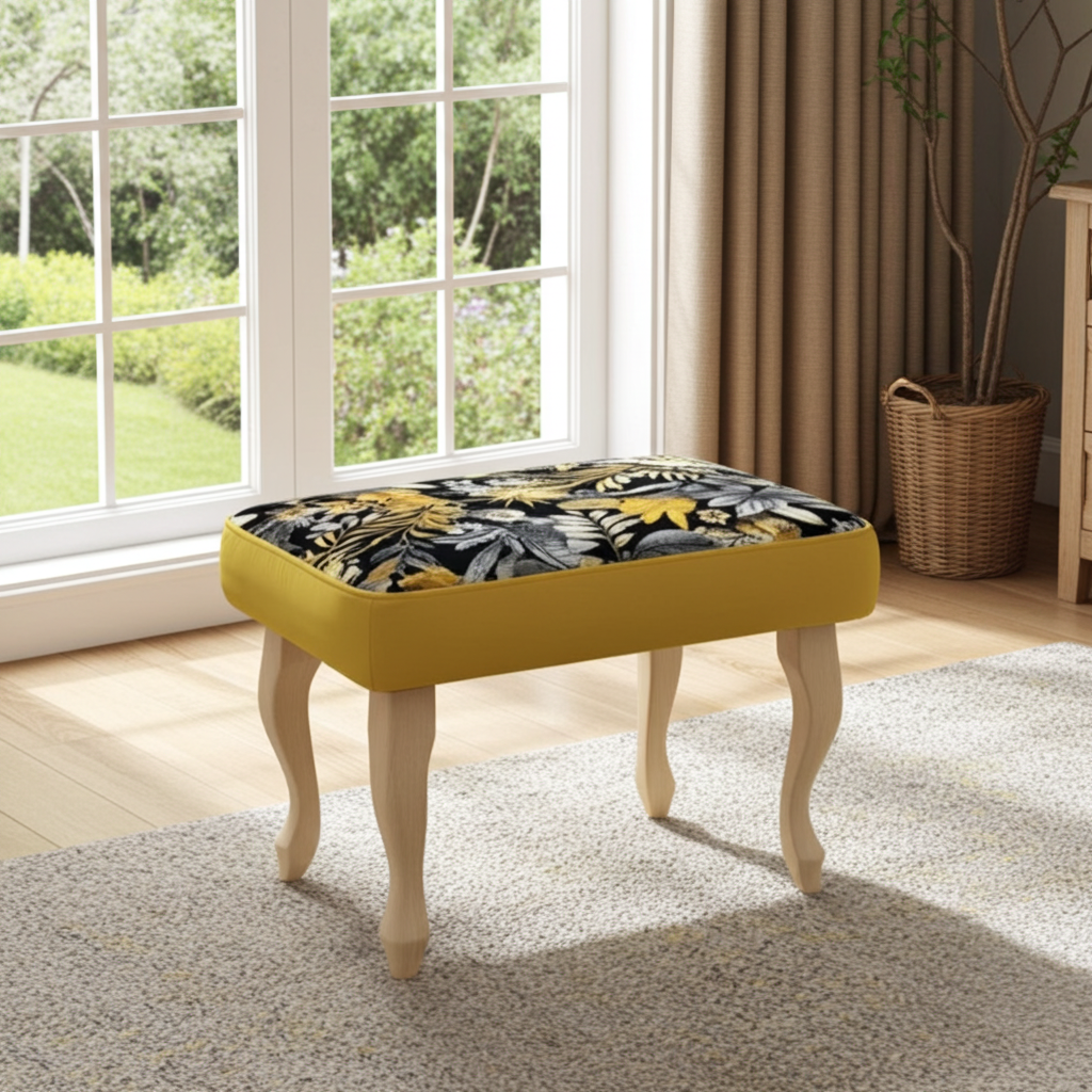 The Verona Velvet Footstool 60×40 cm stands out with its bold yellow base and striking patterned top, making it a perfect accent for any modern or classic Irish interior. Handcrafted with meticulous attention to detail, this footstool features high-quality velvet upholstery and solid lacquered beech wood legs, ensuring both durability and a luxurious feel. Its dimensions—60 x 40 cm with a height of 40 cm—make it versatile for use as a footrest, extra seat, or decorative piece in your living room, bedroom, or hallway2.
