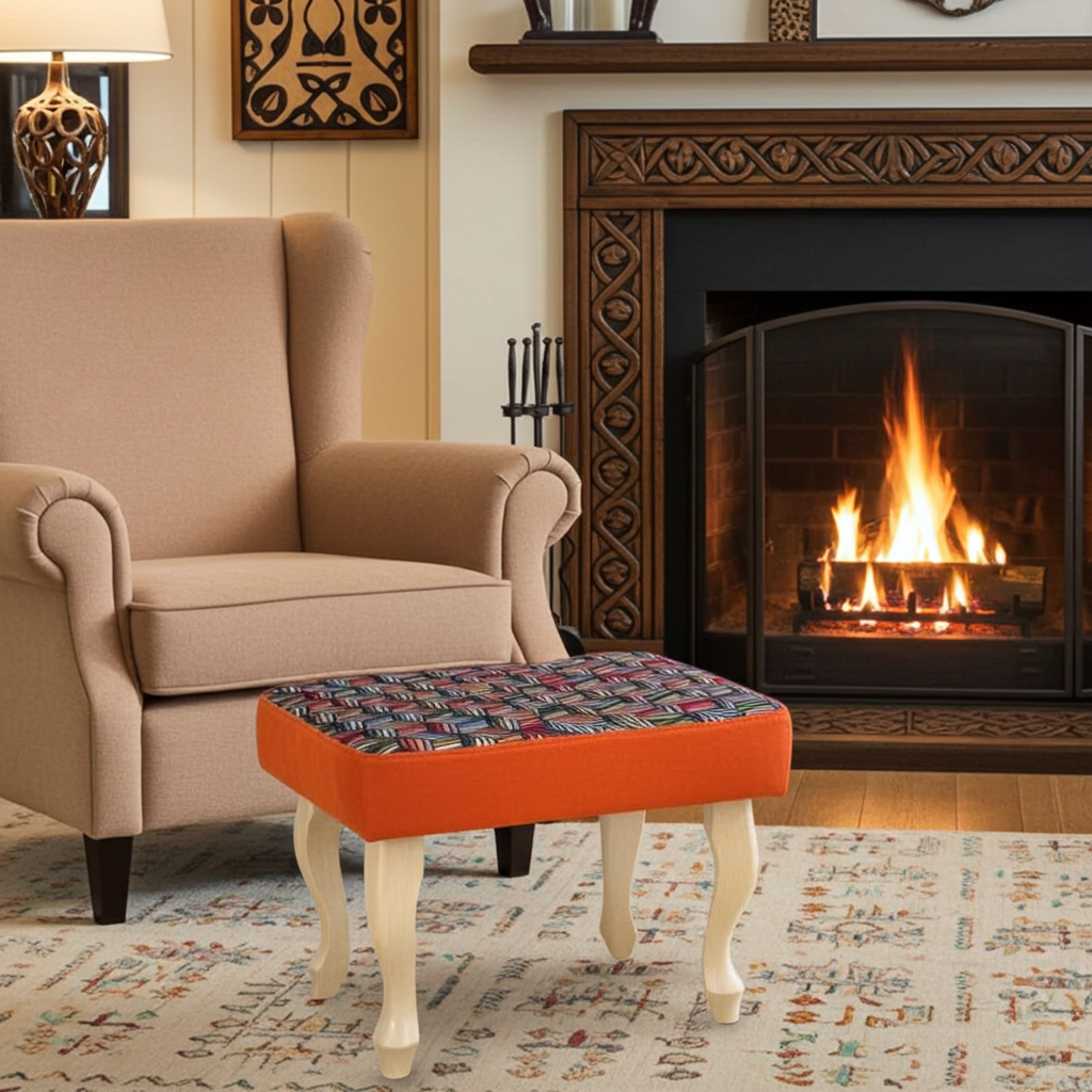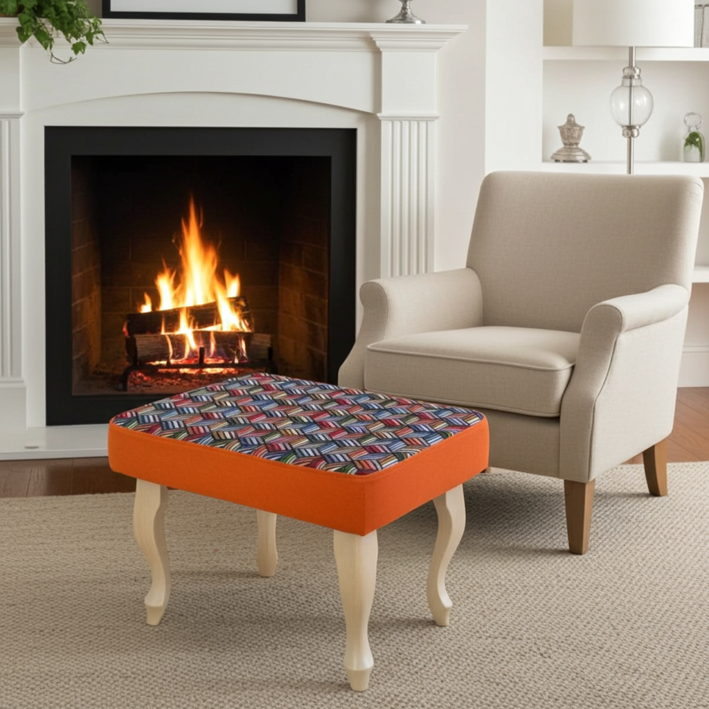 Add energy and personality to your living room with this vibrant geometric velvet footstool. Skilled artisans craft each piece, using a striking 3D multicolour velvet top and bold orange velvet sides. Because the design stands out, it instantly transforms any space. The classic curved beech wood legs, lacquered for durability, provide stability and a timeless finish. Alternatively, you can choose metal legs in gold, black gloss, or rose gold for a contemporary twist.