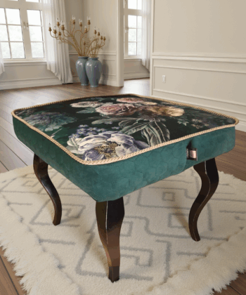 If you love combining elegance with nature-inspired design, this velvet footstool (50x50cm, height 40cm) is the perfect choice. The seat displays a vibrant floral print, surrounded by a golden trim for extra detail. Deep green velvet sides complement the top and blend beautifully with both classic and modern interiors. The sturdy, curved beech wood legs—finished in a rich, dark tone—add a timeless touch. You can personalise the legs by selecting your preferred shape, height, or colour. For an even bolder look, opt for metal legs in gold, black gloss, or rose gold (extra charge applies)23.
