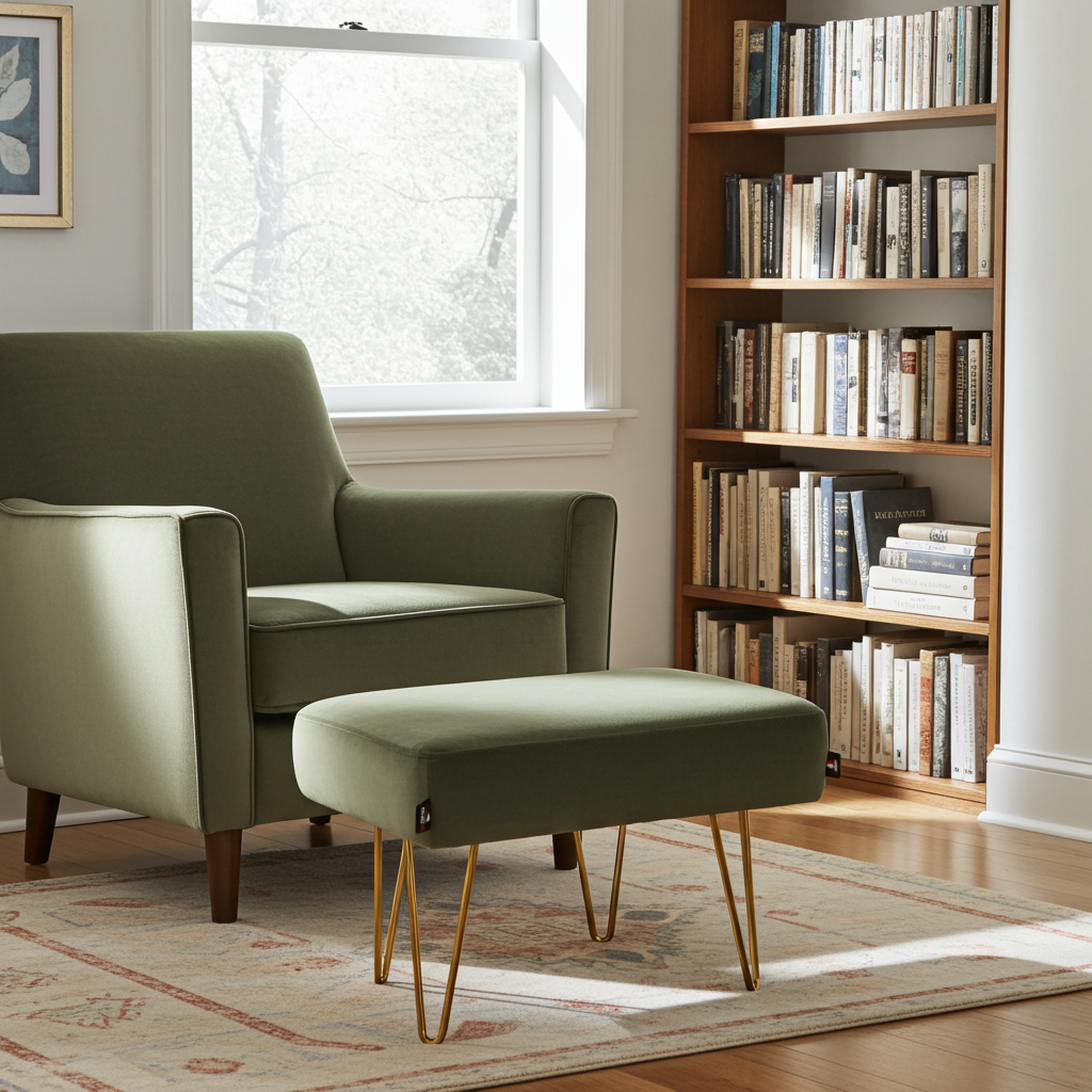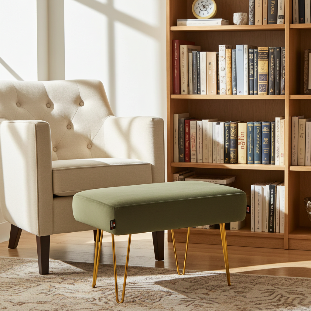 Modern Sage Green Velvet Footstool 60x40cm with Sleek Golden Hairpin Legs for Living Room Comfort