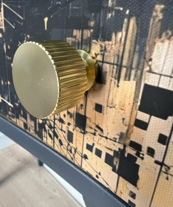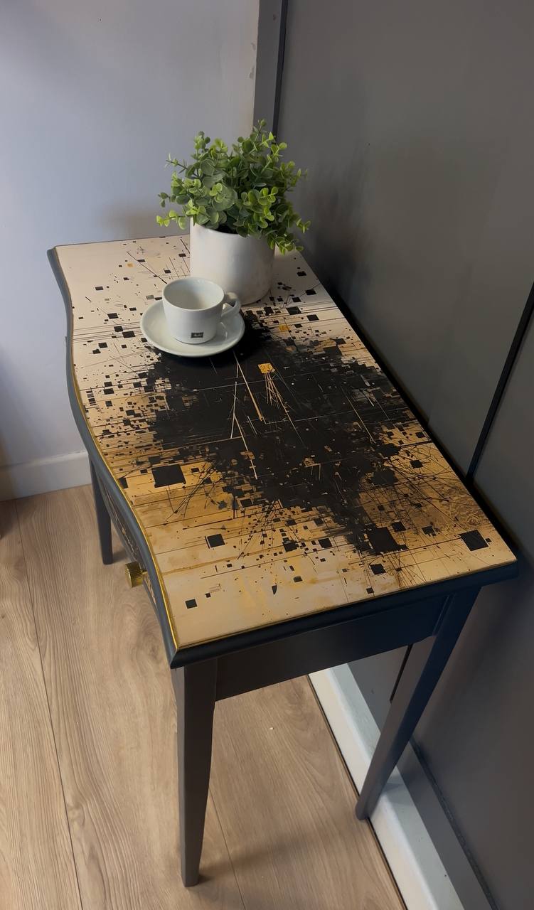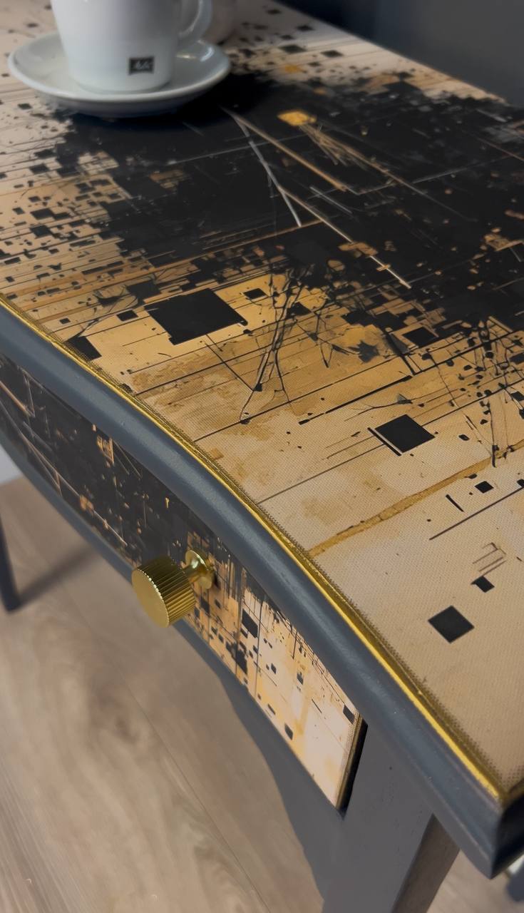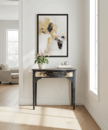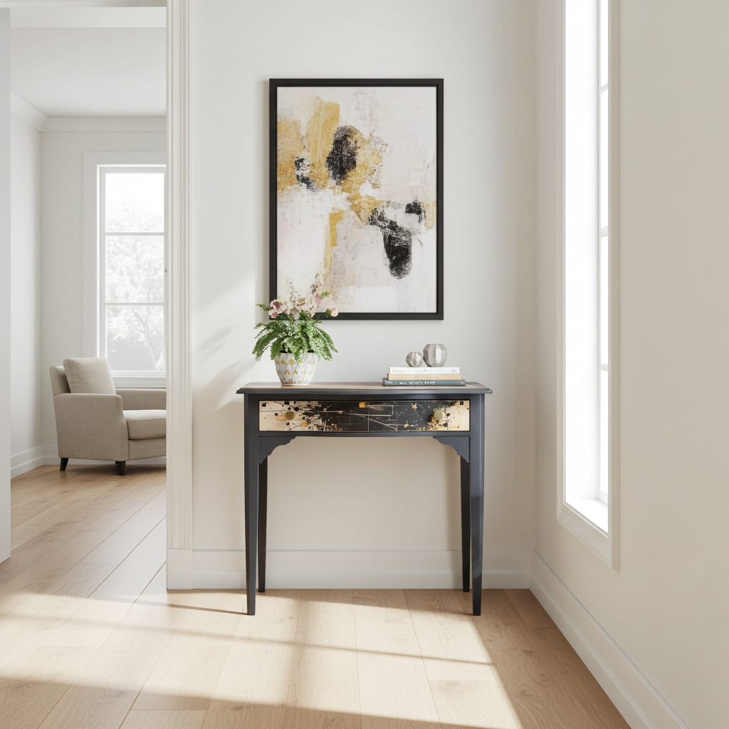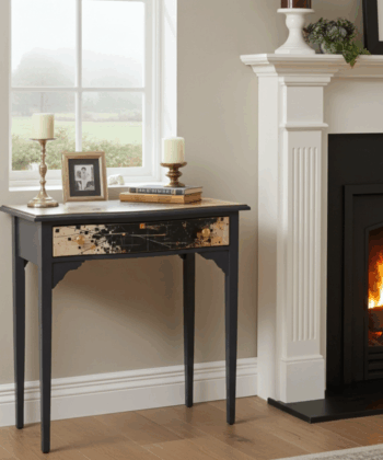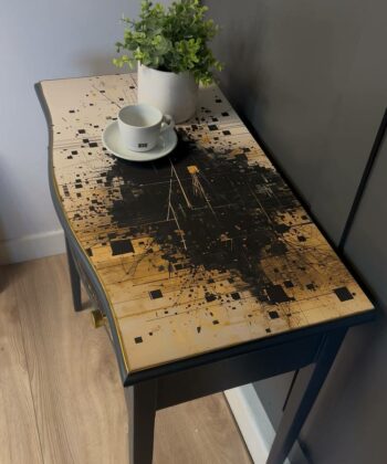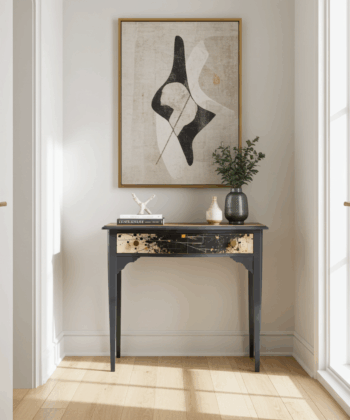 – ✓ Sandblasted and lacquered for a flawless look – ✓ Dimensions: 78 cm (width) x 42 cm (depth) x 76 cm (height) – ✓ Top: Stylish canvas material – ✓ Drawer: Black with gold, artistic highlight – ✓ Frame: Solid wood – ✓ Condition: Excellent, fully restored – ✓ Placement: Hallway, living room, workspace – ✓ Design: One-of-a-kind finish