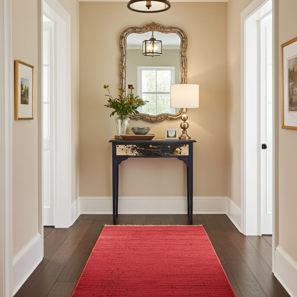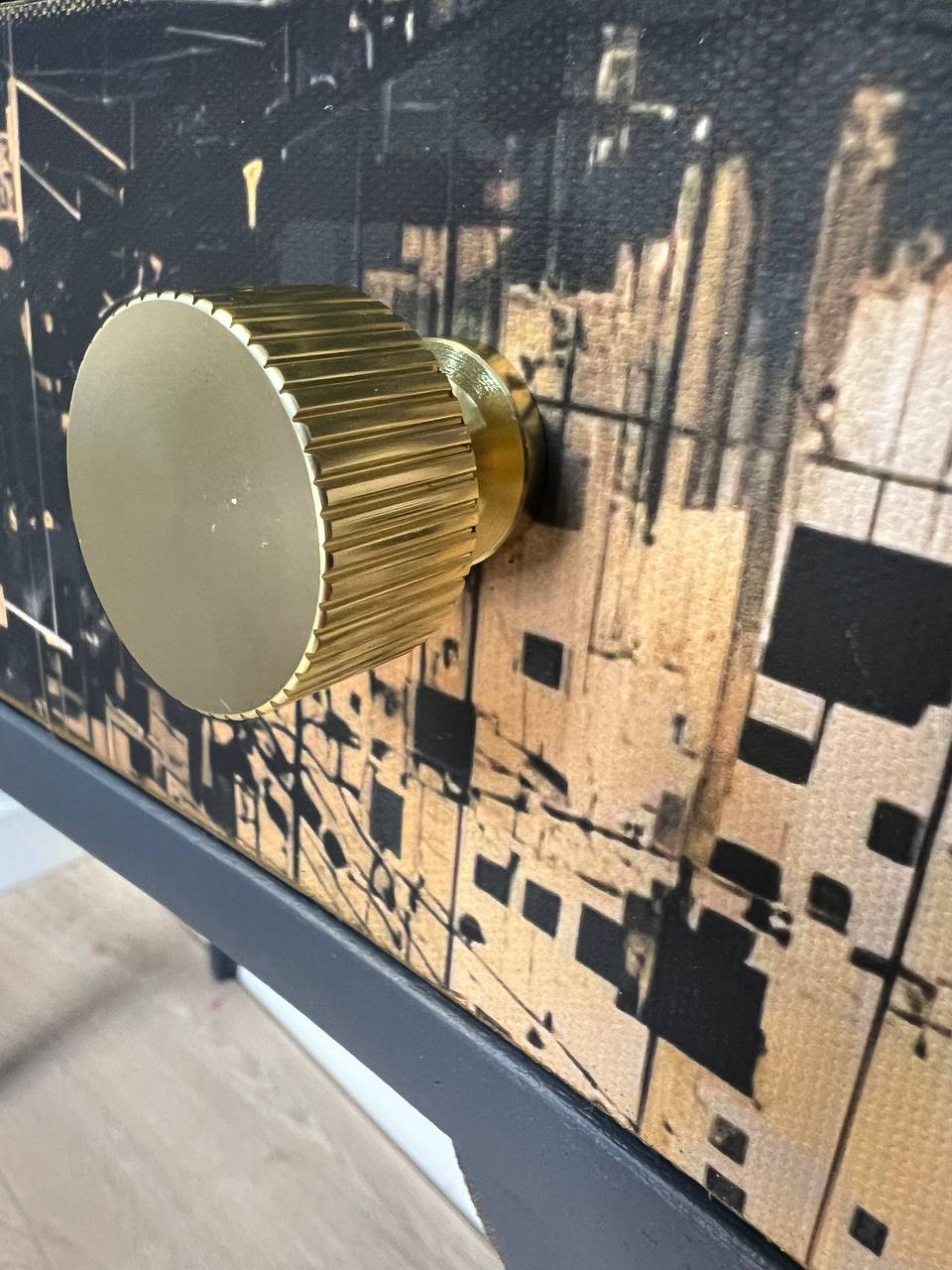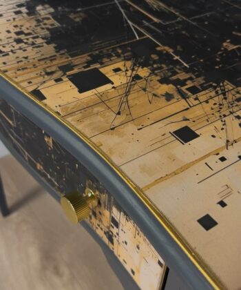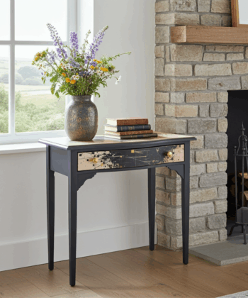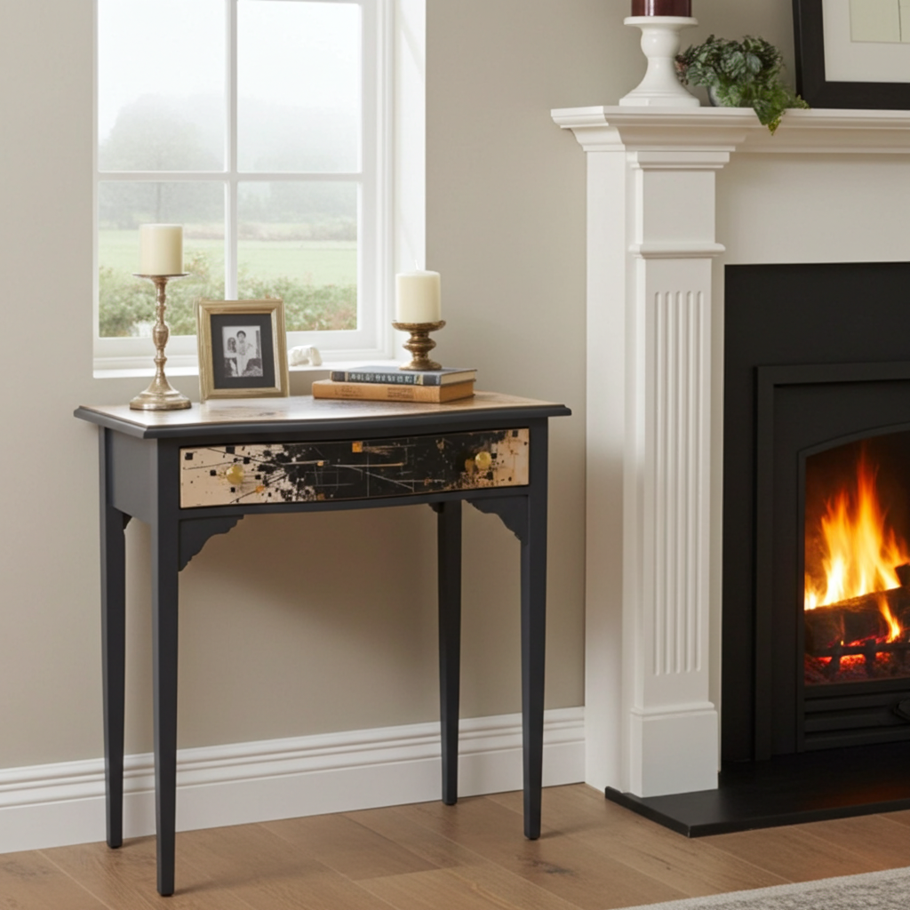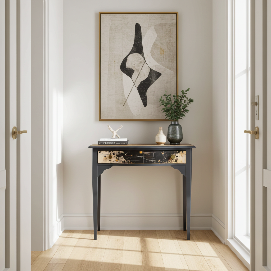 – ✓ Sandblasted and lacquered for a flawless look – ✓ Dimensions: 78 cm (width) x 42 cm (depth) x 76 cm (height) – ✓ Top: Stylish canvas material – ✓ Drawer: Black with gold, artistic highlight – ✓ Frame: Solid wood – ✓ Condition: Excellent, fully restored – ✓ Placement: Hallway, living room, workspace – ✓ Design: One-of-a-kind finish