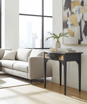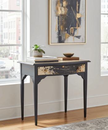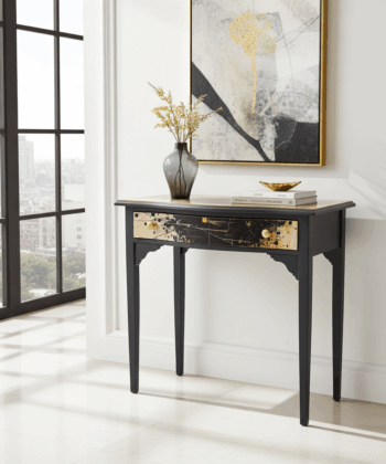Bring modern art and antique character to your home with this Artisan console table. Restorers have stripped, sandblasted, and carefully lacquered every surface, producing a flawless matte black finish. The gold-detailed drawer front makes a bold statement and the sturdy wood frame guarantees lasting quality.