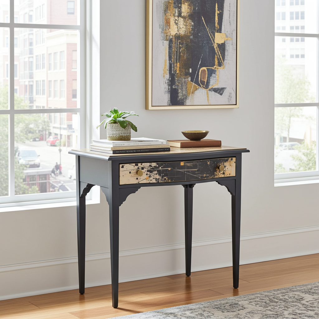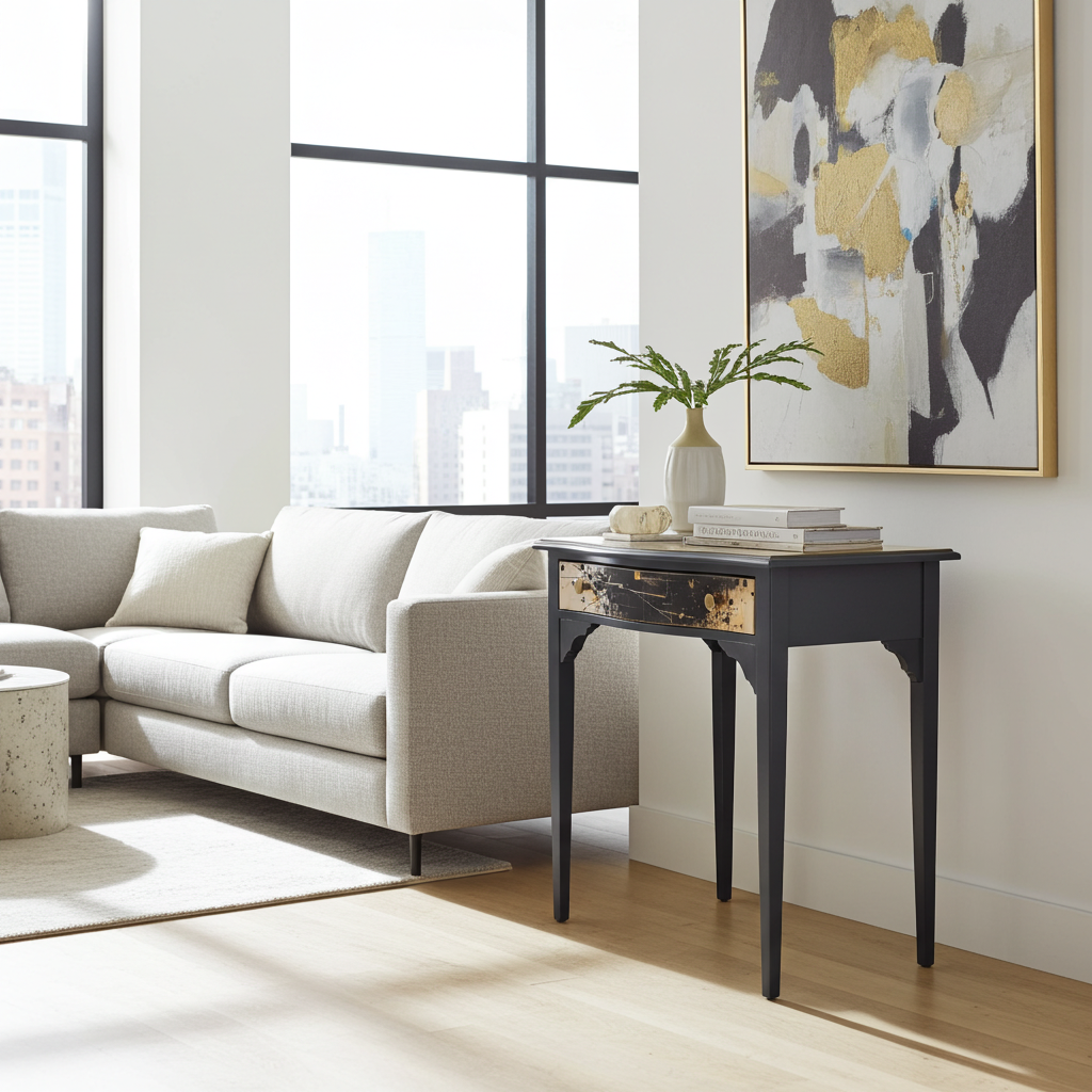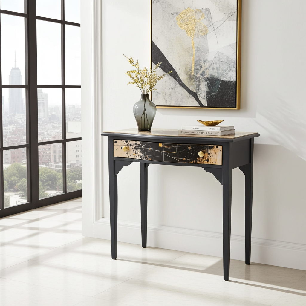 Artisan Black & Gold Restored Console Table with Canvas Top – Fully Refinished, Modern Detail