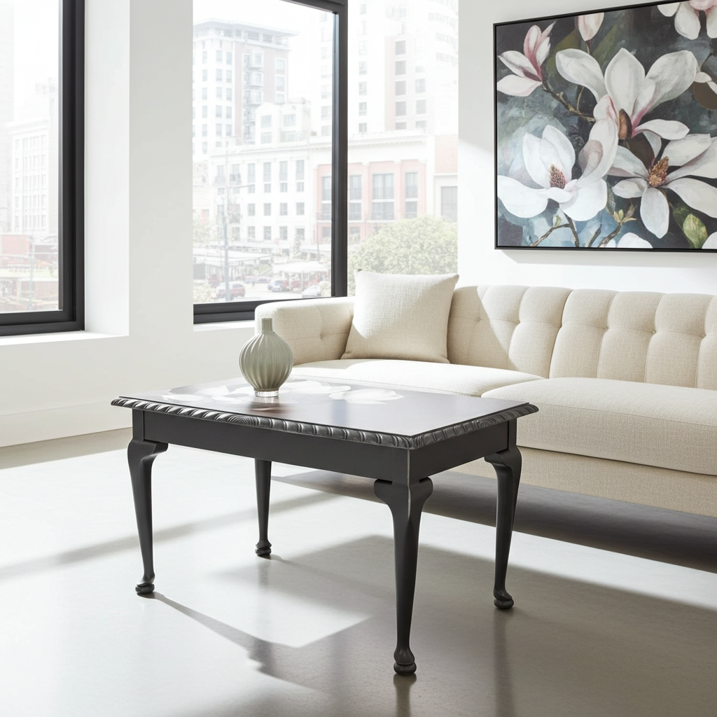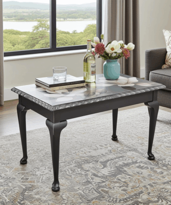 This coffee table stands out with its graceful Queen Anne legs, finished in matte graphite for a modern twist on a classic silhouette. An ornate silver rope edge trim frames the tabletop, adding a touch of vintage elegance. The soft blush pink and gray palette complements neutral or pastel décor, while the solid wood construction ensures lasting durability1.